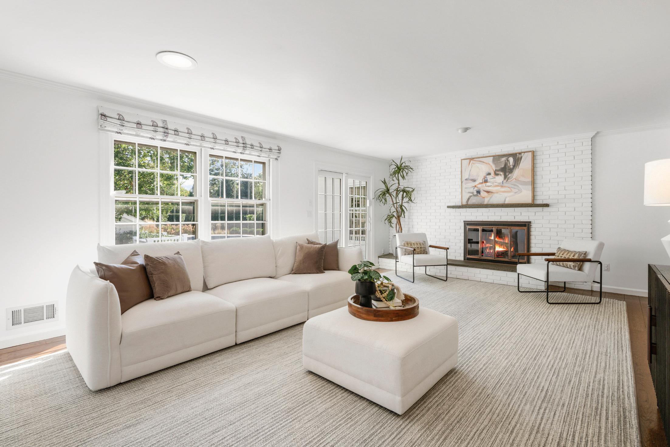 Family room with afireplaceanddoorstothe deck andaprivatehomeofficefor work from home.