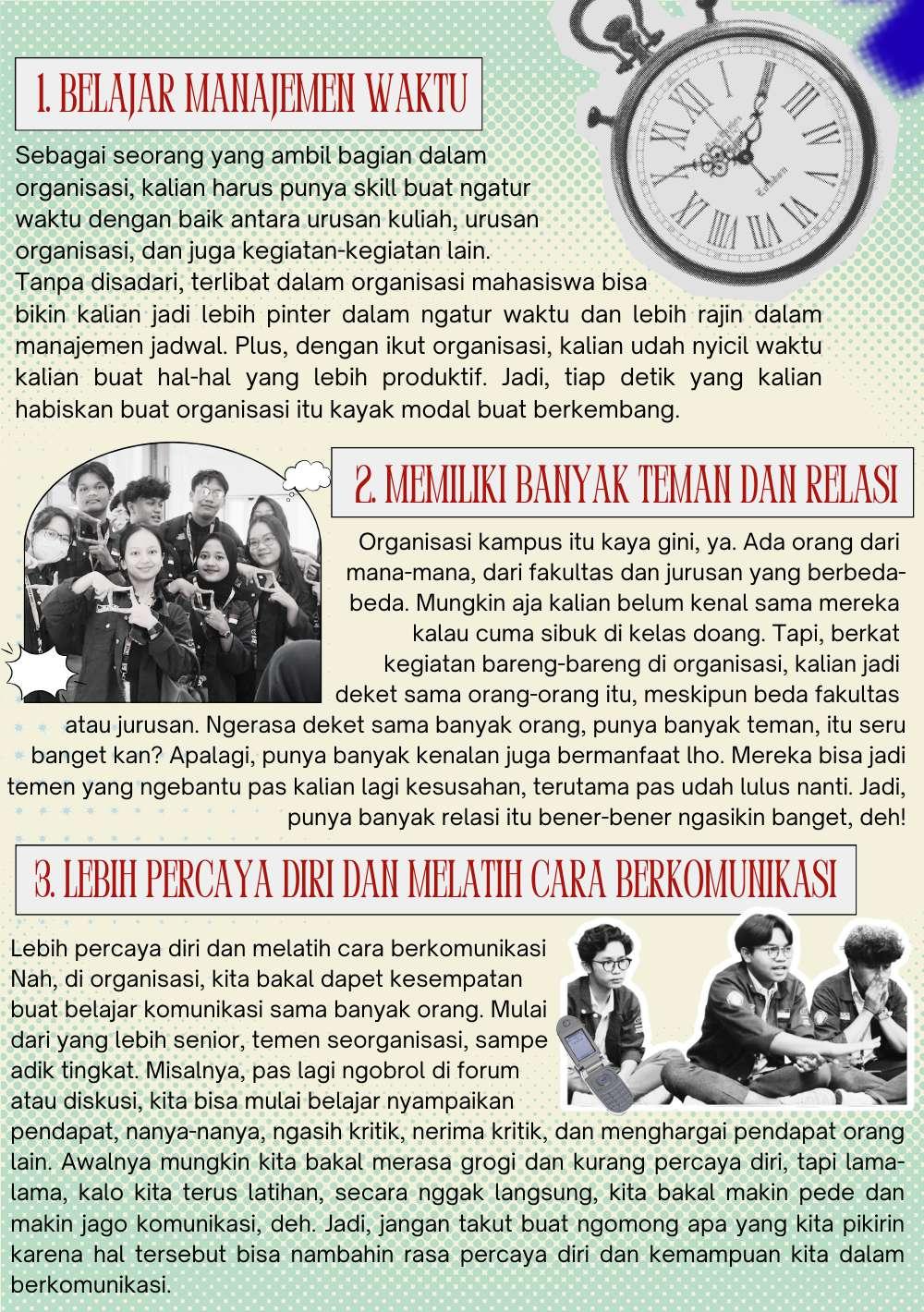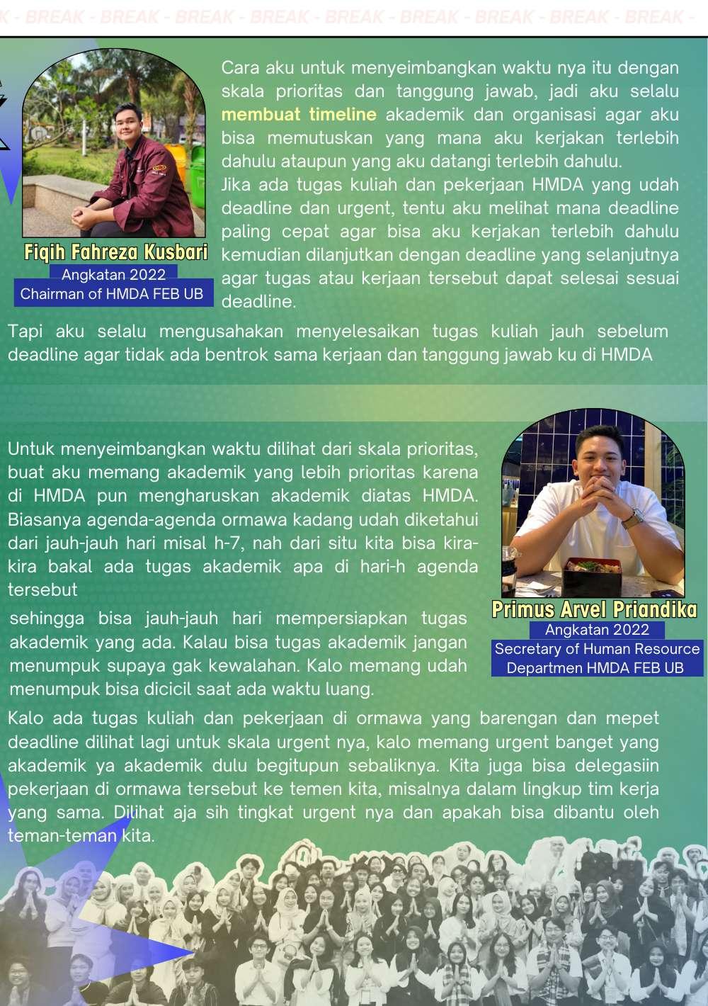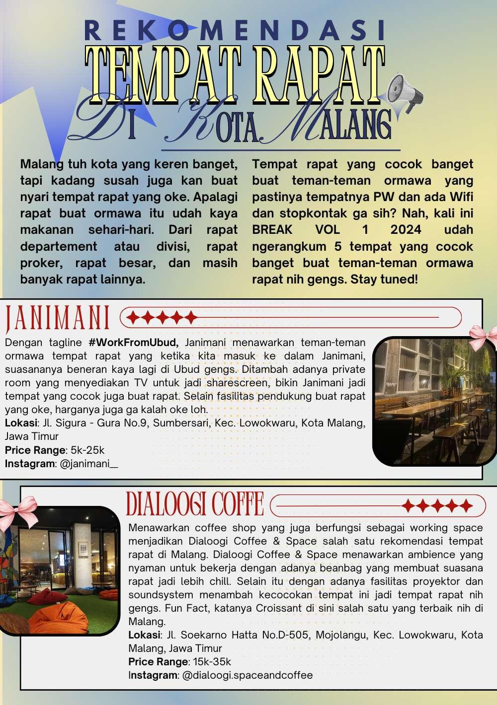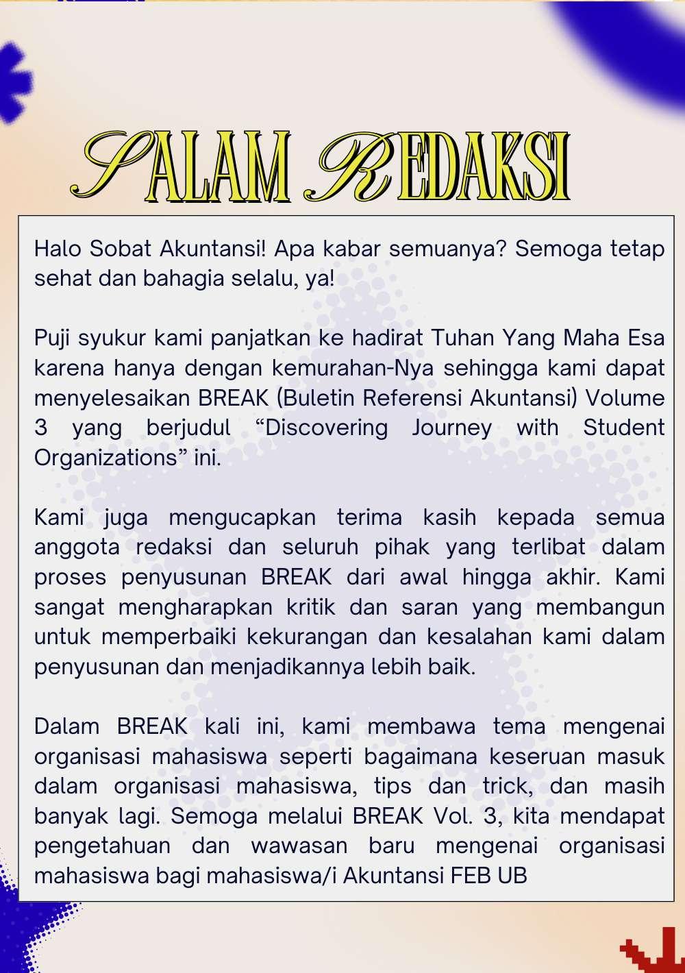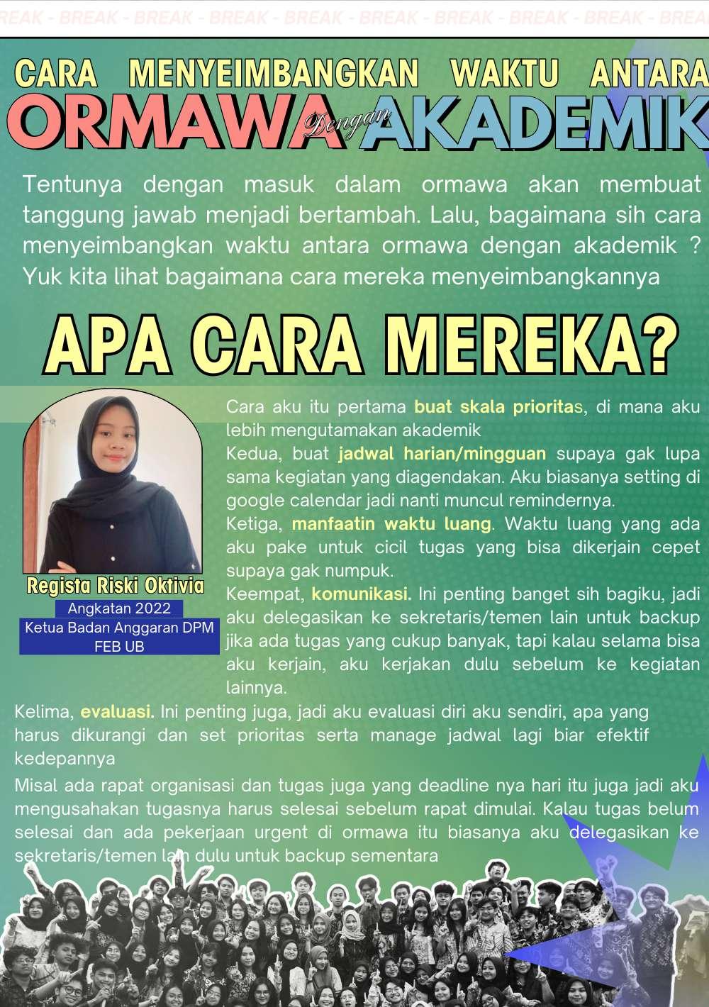BREAK kembali lagi pada Volume 3 yang berjudul "Discovering Journey with Student Organization". Pada BREAK Vol. 3 ini, membahas mengenai organisasi mahasiswa. Kita akan membahas mengapa harus bergabung, tips and trick, stigma sibuk, cara menyeimbangkan waktu, dan rekomendasi tempat rapat. Penasaran gak sih ? Yuk langsung dibaca aja!