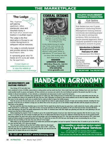 Once liming, N-P-K and sulfur have been considered in terms of fertility, many producers raising pasture and hay would stop there. Some would stop even sooner thinking it just costs more than it could possibly benefit on grasses and legumes. All these nutrients are necessary and could be the most limiting for growth of the present crop. But it is a big mistake to discard micronutrients, or trace elements, as unimportant and unnecessary in order to grow the best grass. One of our best clients in Australia raises grassfed beef on 4,000 acres. After testing his land, he insisted there was no way he could afford even the lime, let alone everything else shown to be needed by the tests.That was 1994. Ultimately, he decided to take several paddocks and do what his budget would allow. After four years, he was saying the results were so positive that he could not afford to ignore the fertility program. From his success over the last eleven years, he said we should tell new clients to apply adequate amounts of major and secondary elements, including the trace elements, in the first year on whatever acreage you can afford.Then on the rest, just go as far as the fertilizer budget will allow until the program has proven out right there on the property. But why would this client from Australia urge us to do this? First he would tell you that his grass has gone from a multi-colored mix of green, yellow, purple, red violet and brown to a verdant green - from fence to fence. On my last visit there he still had one paddock of 160 acres that had not been corrected with these colors still showing in the grass.The gentle temperament of his 1000+ lb. Hereford steers with their bright eyes gleaming and shiny hair coats glistening in the sun seemed more like that of feisty young calves. Before beginning the program it took 15 months to put on the needed 600 pounds of meat per steer which the buyer expected. After the first six years, it was down to 12 months for the same amount of weight gain. But as we talked about this kind of success the cattleman revealed that this was not the greatest benefit now being realized.The steers were sold on dress-out percentage, and in the beginning that was 57%. Over that same period it had increased to 59%, which most would not believe possible for grassfed Hereford steers.This 2% netted him an extra $31,500 that year. And though we were recommending the use of trace elements that were limiting on the land, they were still not “in the budget.” With profits up, the micronutrients shown to be needed were purchased and applied. Last year he reported, “It took less than 10 months to put on the 600 lbs. per steer and that with a 61% dress-out average.” Time and again cattlemen will say that their fertilizer dealer has discouraged For consulting or educational services contact: them from the use of trace elements for grass production. And so will I - unless the soil tests show they are needed for that soil! If that is truly the case and you have the money, don’t let anyone talk you out of using them! 297 County Highway 357, Charleston, Missouri 63834