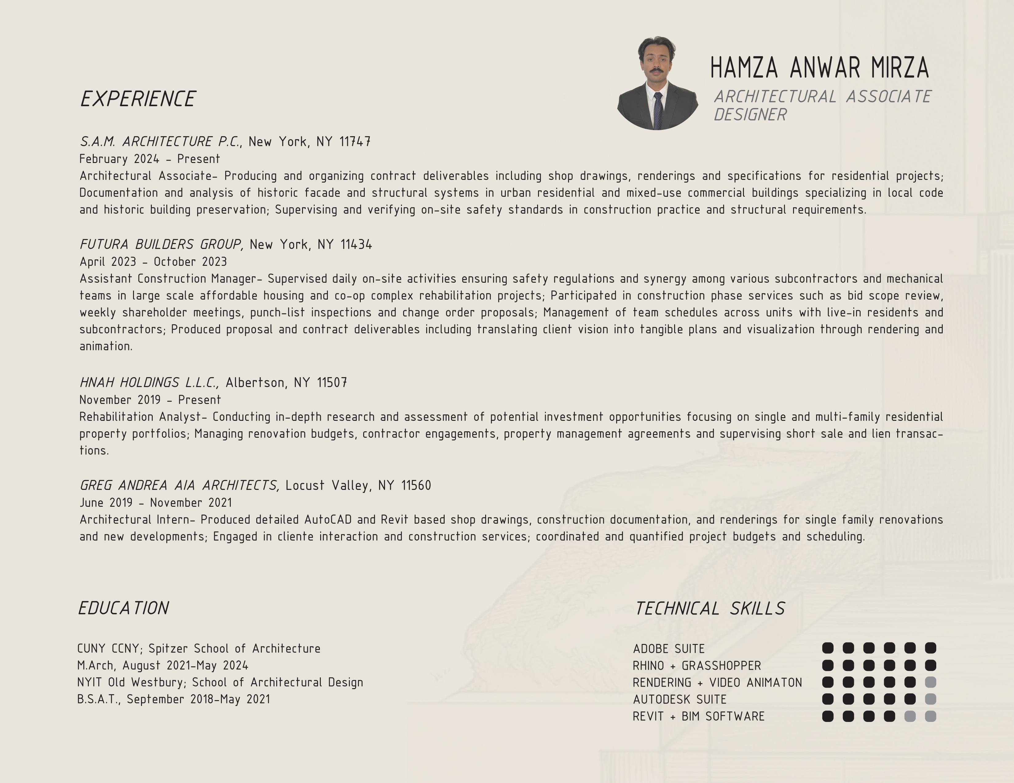 Hamza is a designer and construction specialist with keen interest on intertwining the preservation of architectural identity with creating a more inclusive urban fabric through promoting ecological and social resiliency in housing and planning.