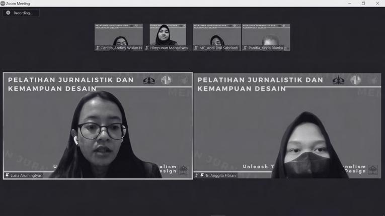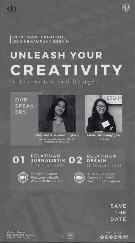 Padakesempatanini,pelatihanjurnalistikdan kemampuan desain mengusung tema "Unleash Your Creativity in Journalism and Design". Adapun pemateri dalam program kerja ini adalah Kak Khairani Kusumaningtyas, S.PWK. dan Kak Lusia Arumingtyas,S.I.Kom.