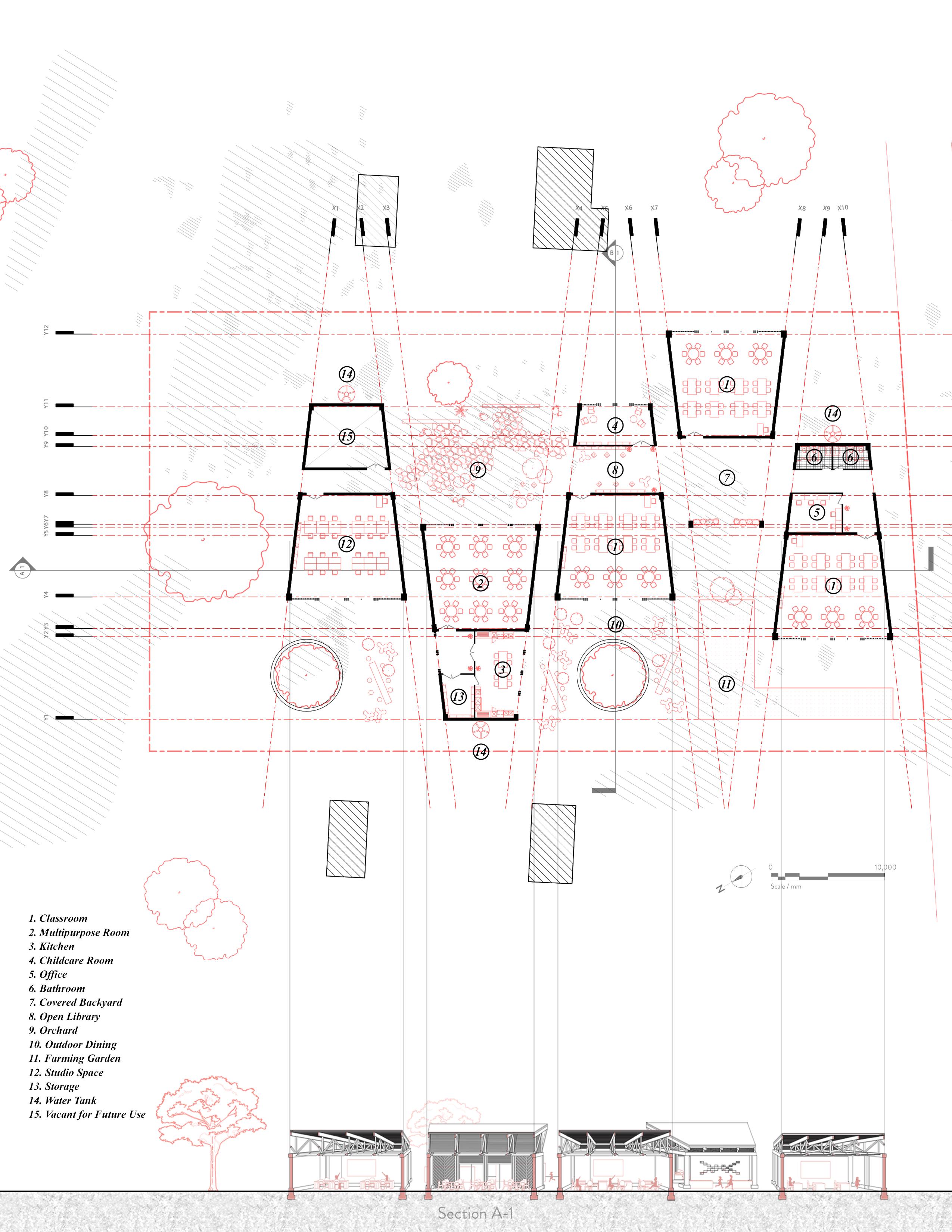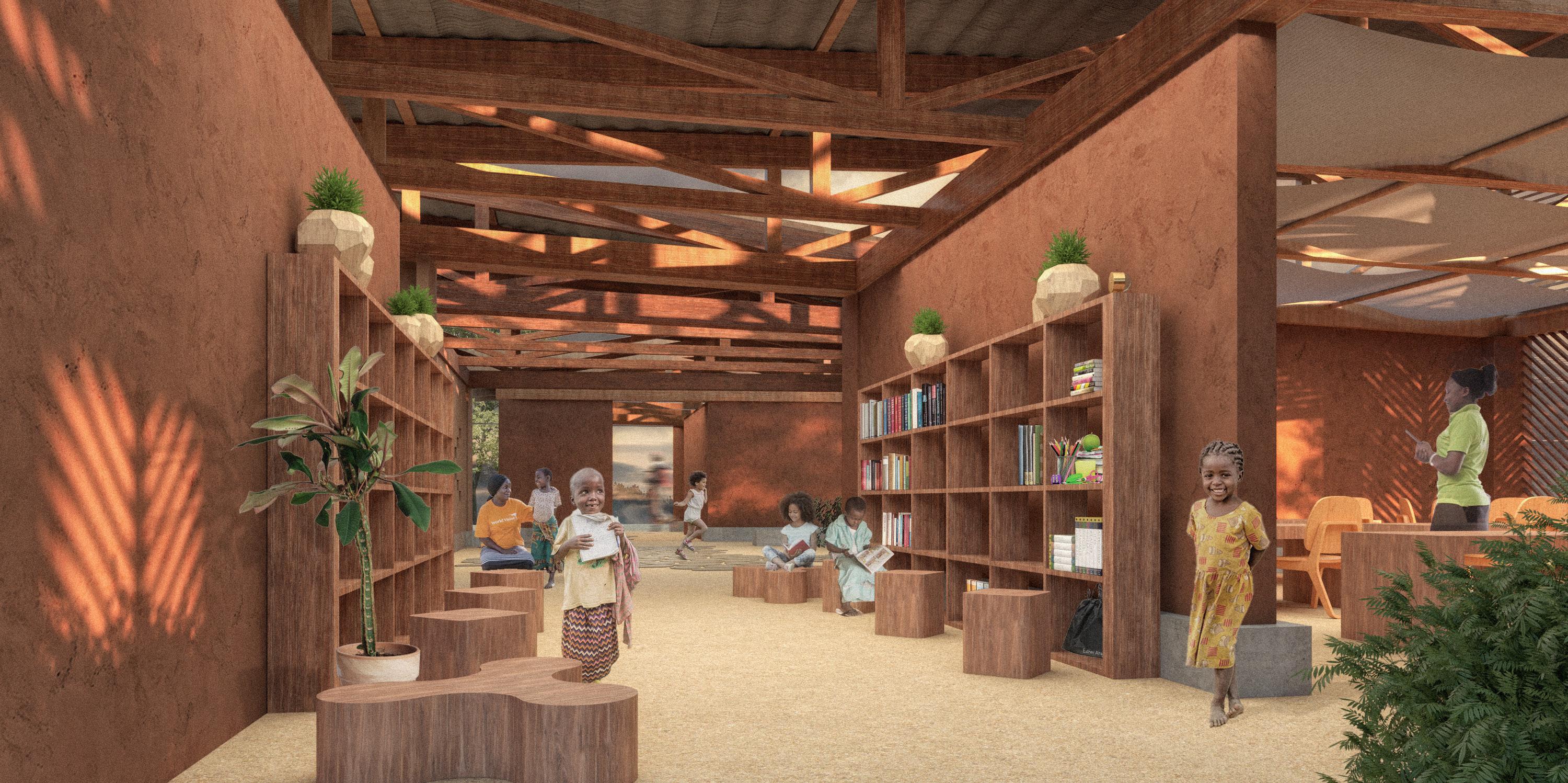 Biophilia has a strong correlation with physical and psychological well-being. Thus the classrooms are placed on the wider end of the trapezoid to open up and bring nature inside. An open library located at the center holds books, school supplies, and students’ belongings. The orchard serves not only as an extension of the room but also as a safe playground with free-standing walls to make the space feel safer and comfortable.