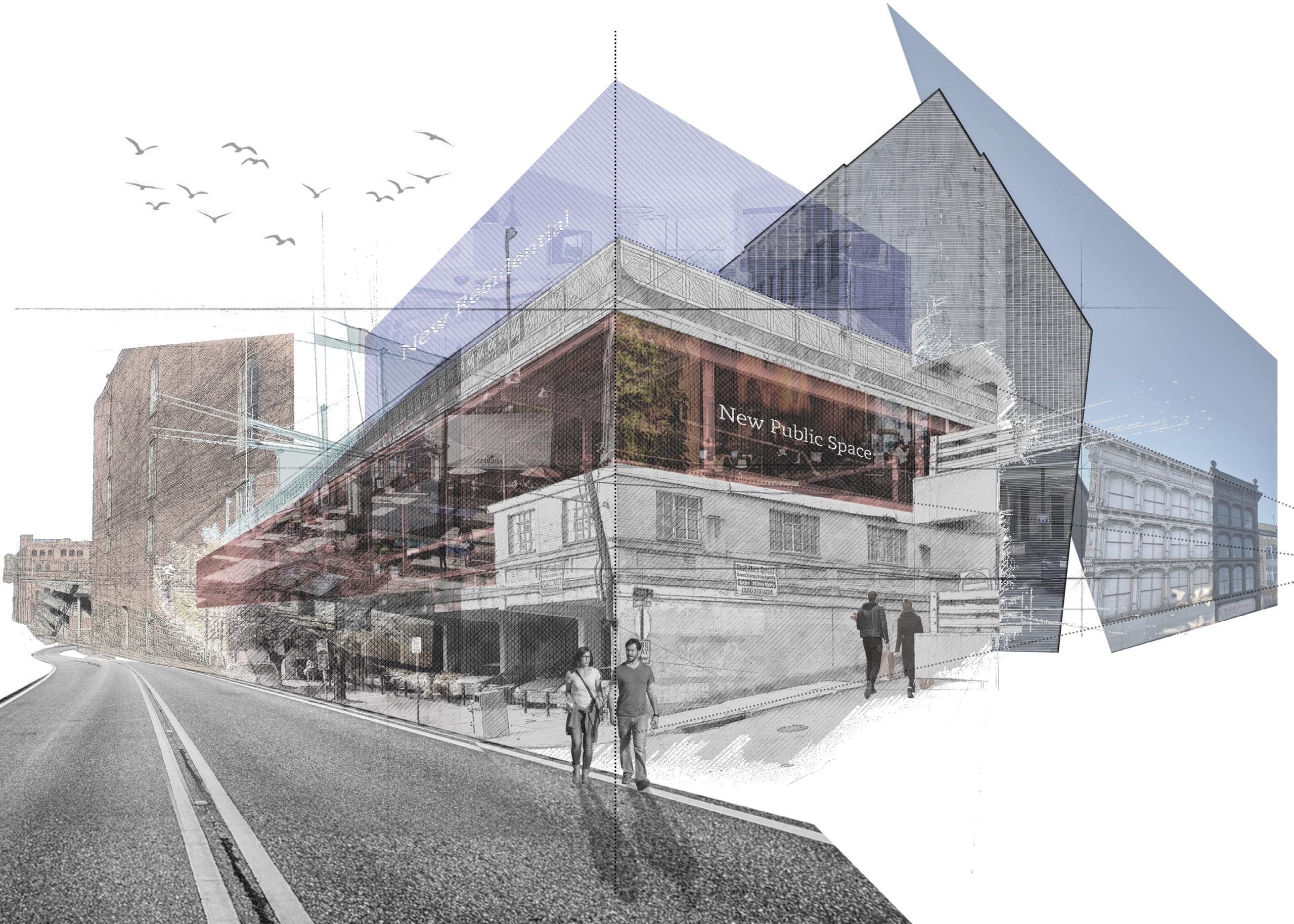 The project site is an outdated, industrial-looking two-story parking garage. The first floor is preserved as a parking lot, and the second floor will be renovated into a civic space that includes a mural gallery, library, restaurants, and souvenir shop. Residential units are stacked on top of the deck, and stairs in the central atrium direct public circulation to the civic space. Taking advantage of the rich front river view, the new residential building is facing the lower buff walk area of Commerce street. To emphasize the architectural history of Lynchburg, arches that repeat throughout the city are replicated in the facade design of the whole.