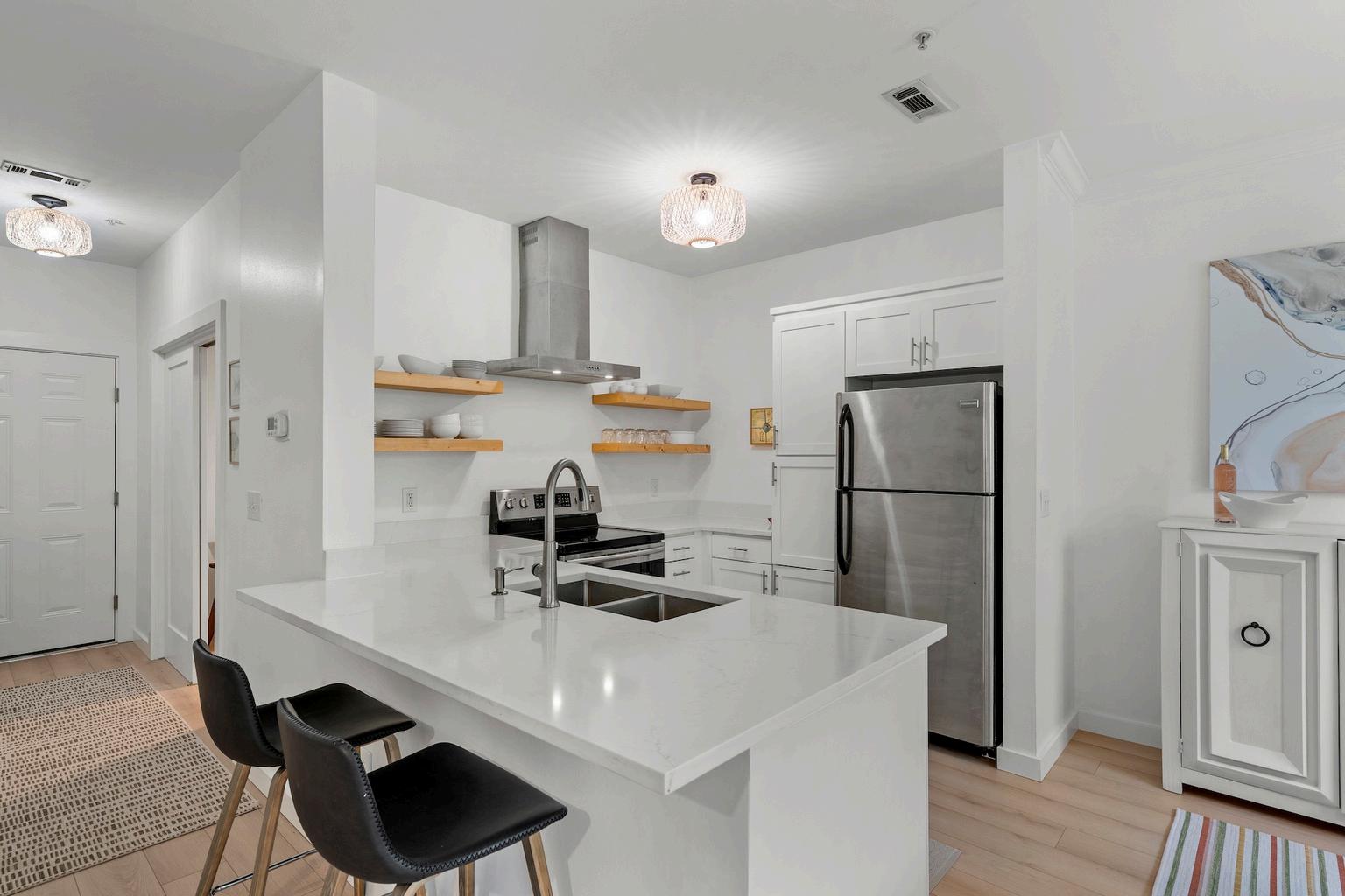 Inside, every detail has been refreshed: the kitchen showcases newly faced cabinets with added open shelving and new countertops, complemented by Luxury Vinyl Plank flooring that runs throughout the home. Updated lighting brightens the space, all walls are freshly painted in Benjamin Moore Bright White for a crisp, modern feel, and the trim has been thoughtfully updated for a polished finish