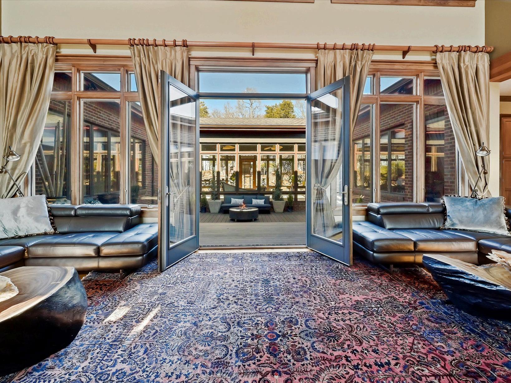 Horse people, whether competitive or recreational, will appreciate the well-laid out turnkey equestrian facilities featuring miles of board fencing, large indoor arena with 5 shedrow stalls, 7-stall main aisle barn, many options for turnout, run-in sheds, tack rooms, washroom, groom ’ s quarters, and an equipment shed big enough to house an RV and trailer The hub of the home is the great room, with soaring stone fireplace,17-foot ceiling, and a clear view and access to the atrium, which creates the illusion of outdoor living indoors.