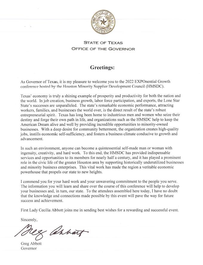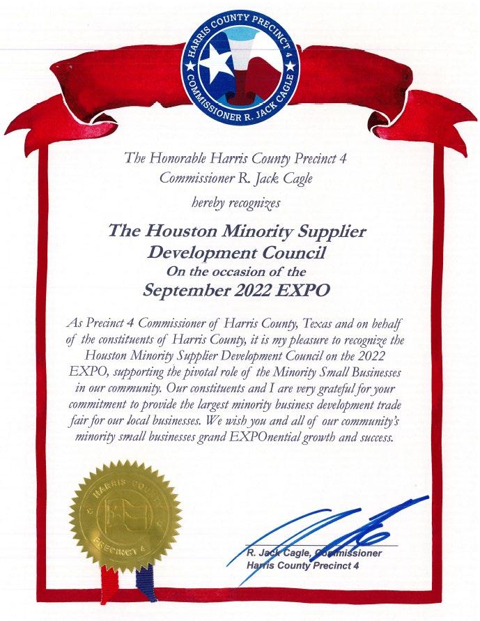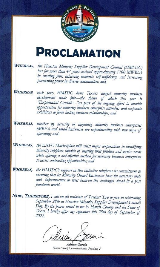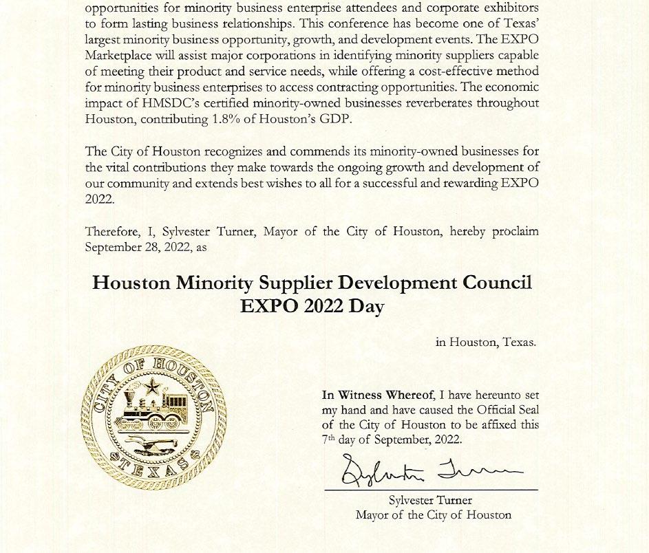 I would like to extend my most sincere support to the Houston Minority Supplier Development Council (HMSDC) as they host the EXPO 2022 in a hybrid format. This event is the largest minority business development trade fair in Texas