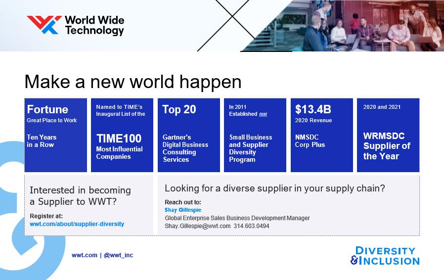 World Wide Technology (WWT), the largest black owned firm in the US, is a $13 billion global technology provider and systems integrator that technology products and services to large public and private organizations. WWT’s focus areas include infrastructure modernization, digital strategy, security transformation and multi cloud architecture.