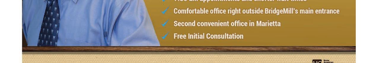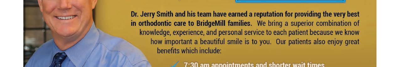 The BridgeMill News is published monthly by BridgeMill Athletic Club. Please support the businesses that advertise to make publishing your magazine possible. Advertisers assume responsibility for the content of the ads placed in this publication. Material published may not be reproduced without the written permission of BridgeMill Athletic Club. The information and advertisements contained in this magazine are provided for the members of BridgeMill Athletic Club as a courtesy only.