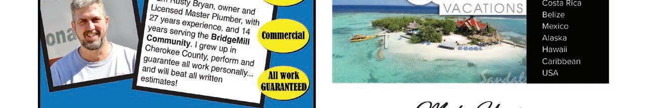 PAGE 35 | DECEMBER 2022 770.345.5500 BridgeMill AutoCare Center 770.720.0765 Located next to CVS at Bells Ferry and Sixes Road Complete auto repair. 12 month/12,000 mile warranty on all repairs. $19.95 Oil Change Special for BridgeMill Residents *All Fluids Checked & Filled *Oil & Oil Filter *Tire Pressures Checked *Lubrication FREE Tire Rotation & Brake Inspection Most Cars & Light Trucks. Includes up to 5 quarts of Motor Oil. Must present coupon at time of service. Some cars, trucks, diesels, extra. $10 Off Any Service Over $100 or $20 Off Any Service Over $200. B Ca in f $26.95 expires 12/31/22 ADVERTISING SPONSOR Center Sixes Road month/12,000 Special Residents Filter quarts of service. $100 or $200. Interior and Exterior 678-608-9285 Credit Cards Accepted Carpentry PressureWashing CabinetPainting Deck&FenceStaining GutterCleaning Drywall&Repair CeilingsWalls&Trim WallPaperRemoval L icensed & Insured BridgeMill R efe rences Available Call or Email for a Free Estimate in fo@ friendlymonsterpainting com ADVERTISING SPONSOR ADVERTISING SPONSOR