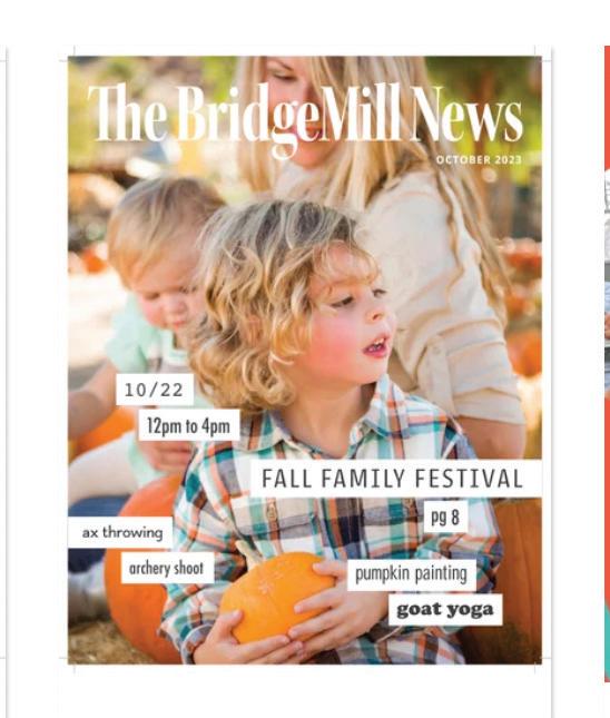 The BridgeMill News is published monthly by BridgeMill Athletic Club. Please support the businesses that advertise to make publishing your magazine possible. Advertisers assume responsibility for the content of the ads placed in this publication. Material published may not be reproduced without the written permission of BridgeMill Athletic Club. The information and advertisements contained in this magazine are provided for the members of BridgeMill Athletic Club as a courtesy only.