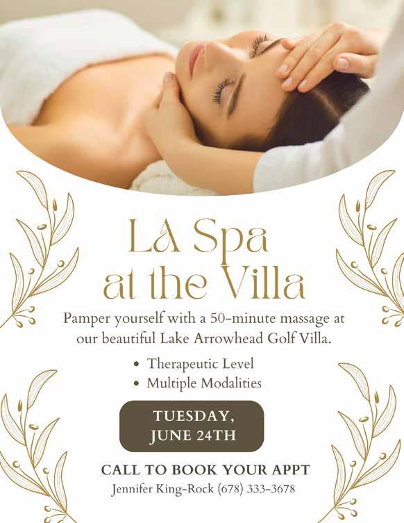 Lake Arrowhead Living is published FOR FREE by Front Porch Atlanta for Lake Arrowhead Yacht & Country Club and the Lake Arrowhead Property Owners Association. Please support the businesses that advertise to make publishing your newsletter possible. Subject matter published is the opinion of the author and does not necessarily reflect the opinion of the publisher of this newsletter. Professional advice should be obtained before making any decision in which a professional is readily available. Advertisers assume responsibility for the content of the ads placed in this publication. Material published may not be reproduced without the written permission of Front Porch Atlanta.