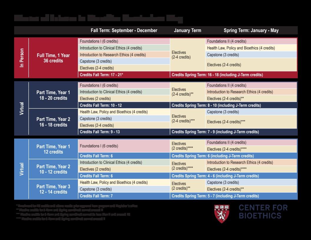The Master of Science in Bioethics degree (SM in Bioethics) is a 36-credit program that may be completed on a full-time or part-time basis. The full-time program is completed in one academic year and the part-time program is typically completed in an online format over two academic years. A limited number of students may request to be enrolled in a three-year parttime course of study. The three-year option does not qualify for federal financial aid and must be selected and approved prior to the first add-drop period of the student’s enrollment. See Section 2.06 of the HMS Master’s Student Handbook for definitions of full- and part-time.