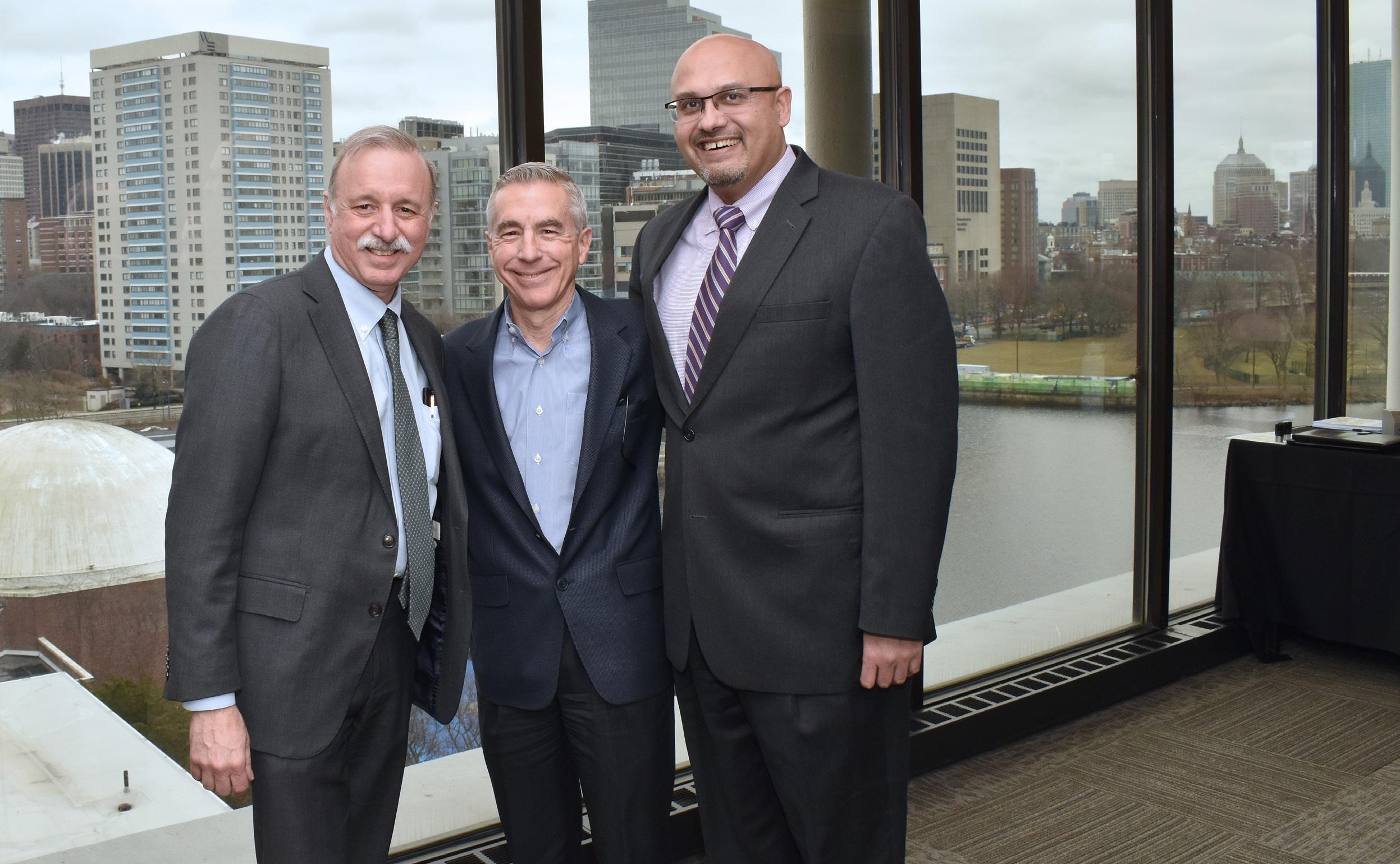 Derrick T. Lin, MD, FACS, (center) stands between Mark A. Varvares, MD, FACS, (left) and CarolAnn Williams (right), interim President of Mass Eye and Ear.