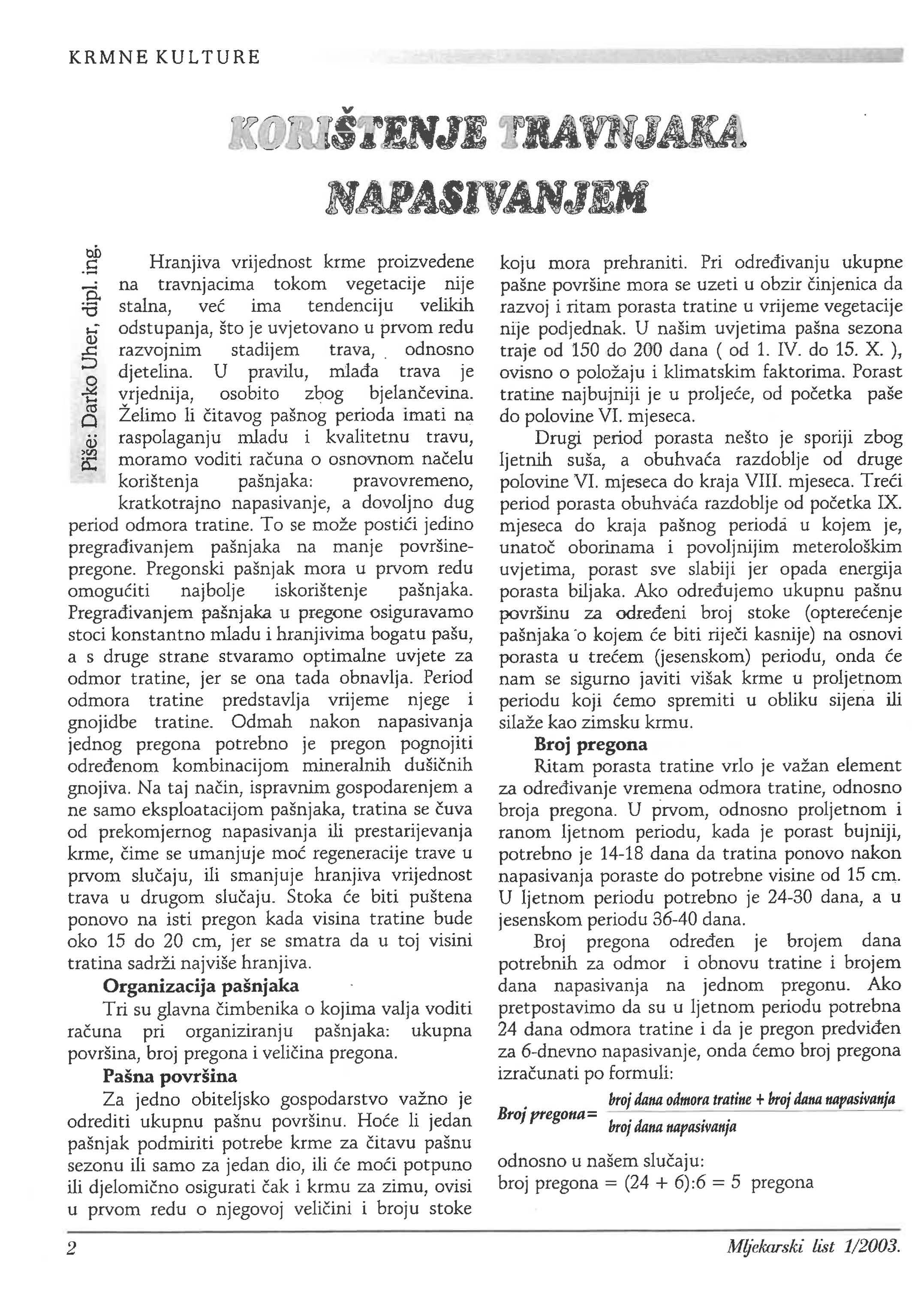 pregona je dužinom ispaše jednog pregona i brojem stoke koja mora pasti na tom pregpnu. travnjak s visinom tratine od 15 cm na 100 m 2 daje 65 kg zelene mase, što je dovoljno krme za jedan dan za jednu kravu težine od 500 kg (krava teška 500 kg predstavlia 1 uvjetno grlo - U.G.). Ako na jednom pregonu pase 10 U.G., .onda pregona za jednodnevno napasivanje mora biti 1000 m 2 (100 m 2 x 10 U.G.), za trodnevno napasivanje 6000 m 2 • Jasno je da ravnomjemost napasivanja ovisi o pregona za isti broj U.G., odnosno pri istom opterepašnjaka je onaj broj uvjetnih grla koji pase na 1 ha pašnjaka pašne sezone. pravilno njegovariog pašnjaka u našim prilikama se od 2-3 U.G./ha, pa ako ima 5 U.G., onda nam je potrebno oko 2 ha ukupne pašne površine da bismo prehranili 5 U.G. pašne sezone.