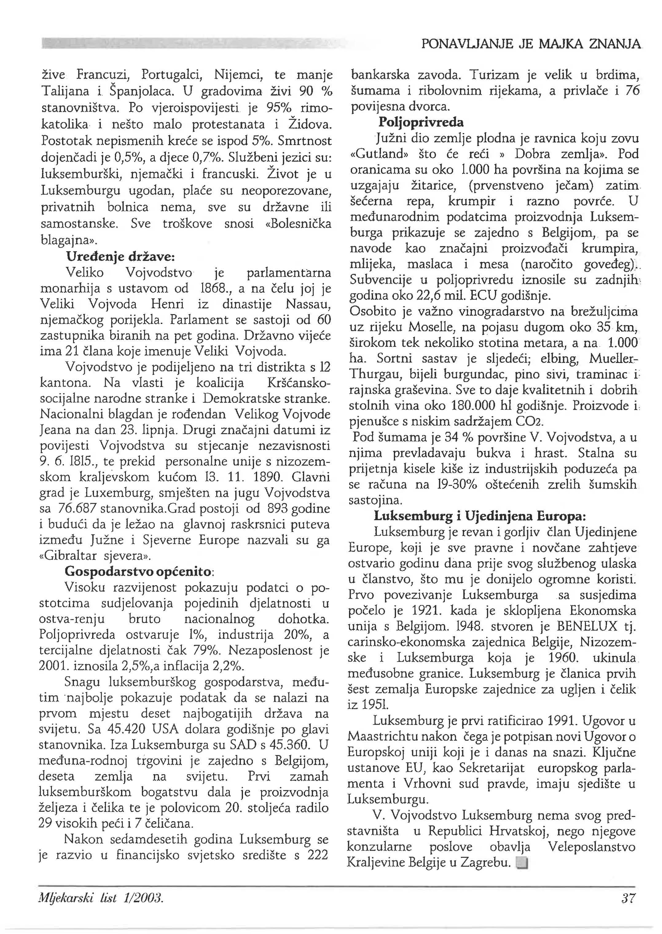 21ve Francuzi, Portugalci, Nijemci, te manje Talijana i Španjolaca. U gradovima živi 90 % stanovništva. Po vjeroispovijesti. je 95%_ rimokatolika i nešto malo protestanata i Zidova. Postotak nepismenih se ispod 5%. Smrtnost je 0,5%, a djece 0,7%. Službe~ jezici su: luksemburški, i francuski. Zivot je u Luksemburgu ugodan, su neoporezovane, privatnih bolnica nema, sve su državne ili samostanske. Sve troškove snosi blagajna».
