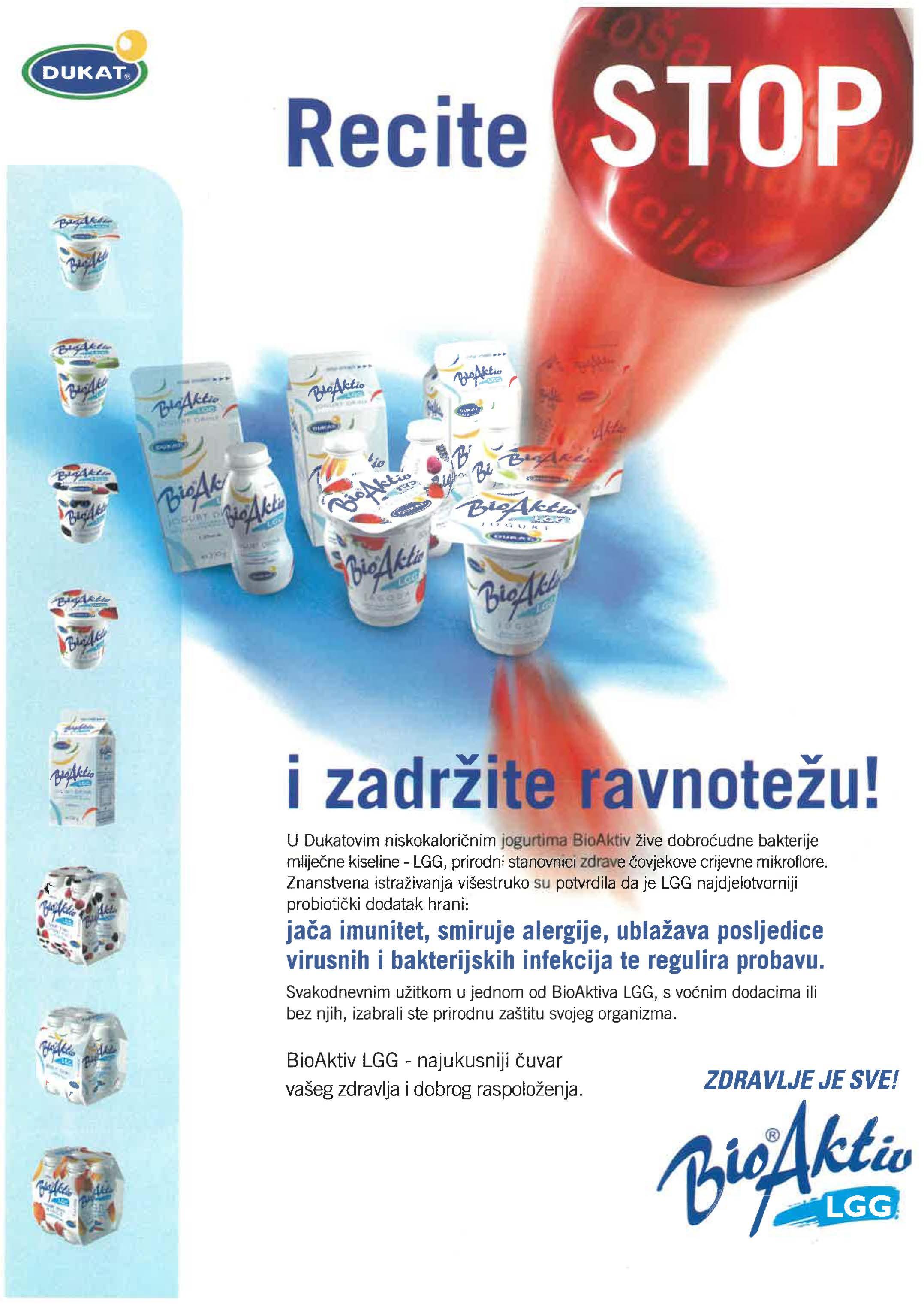 U Dukatovim jogurtimaBloAktivžive bakterije kiseline- LGG,prirodnistanovrncizdrave crijevnemikroflore. Znanstvenaistraživanjavišestrukosu potvrdila da je LGG najdjelotvorniji dodatak hrani: imunitet,smirujealergije,ublažavaposljedice virusnih i bakterijskihinfekcijate reguliraprobavu.