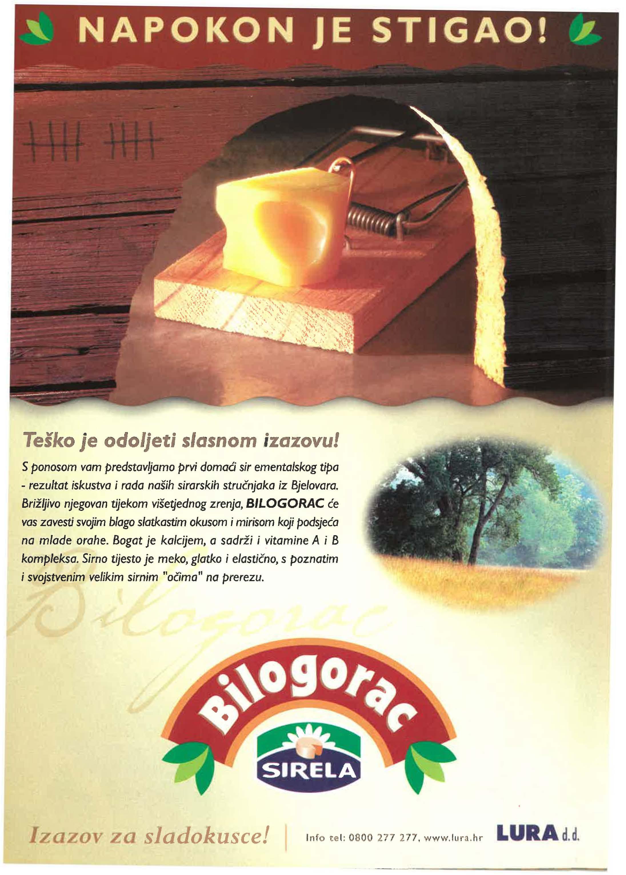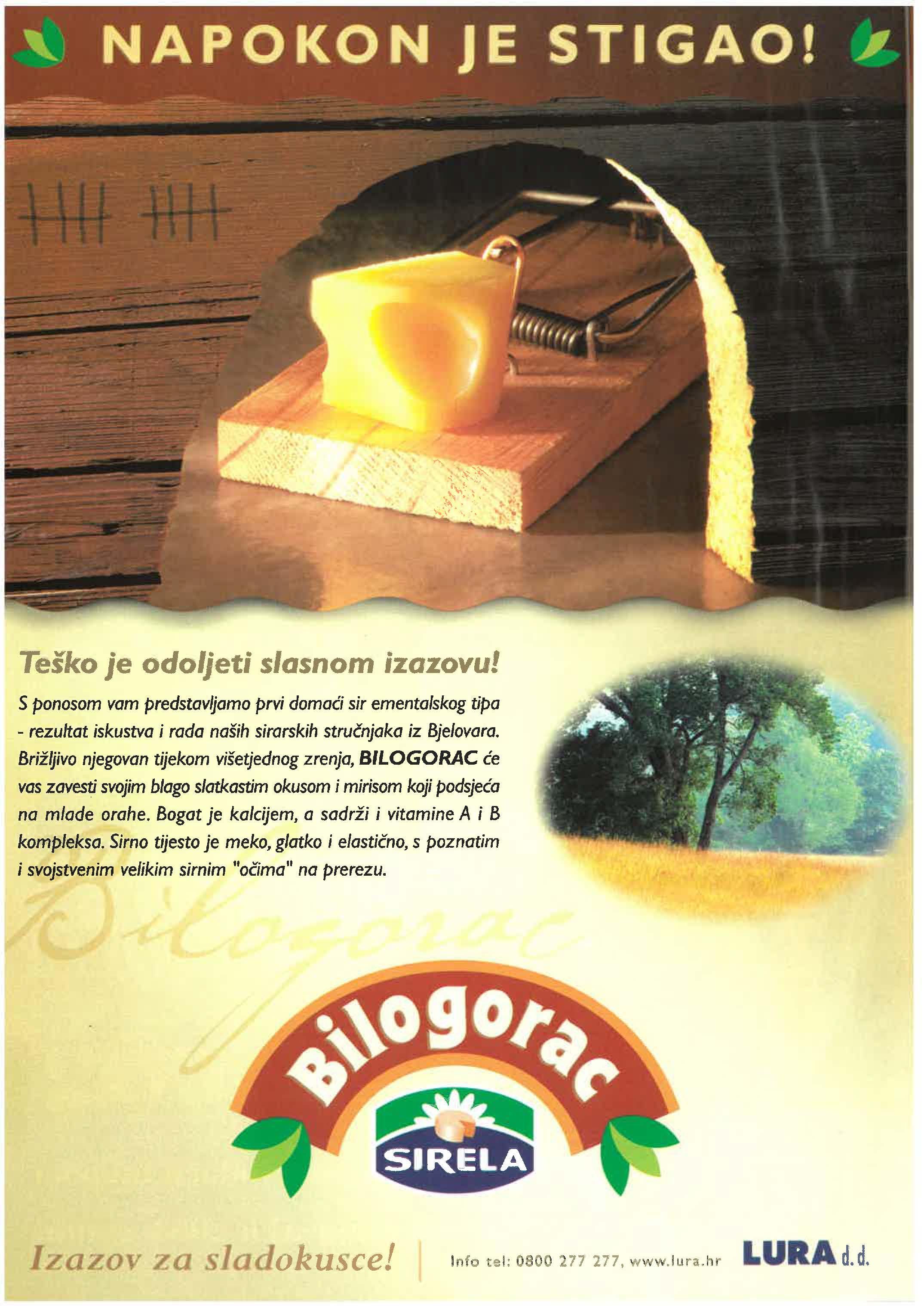 S ponosom vam predstavljamoprvi sir ementalskogtipa - rezultat iskustvai rada našihsirarskih iz Bjelovara. Brižljivonjegovantijekom višetjednogzrenja, BILOGORAC vaszavestisvojimblagoslatkastimokusomi mirisomkoji na mlade orahe. Bogatje kalcijem,a sadrži i vitamine A i B kompleksa.Sirnotijestoje meko, glatko i s poznatim i svojstvenimvelikimsirnim na prerezu.