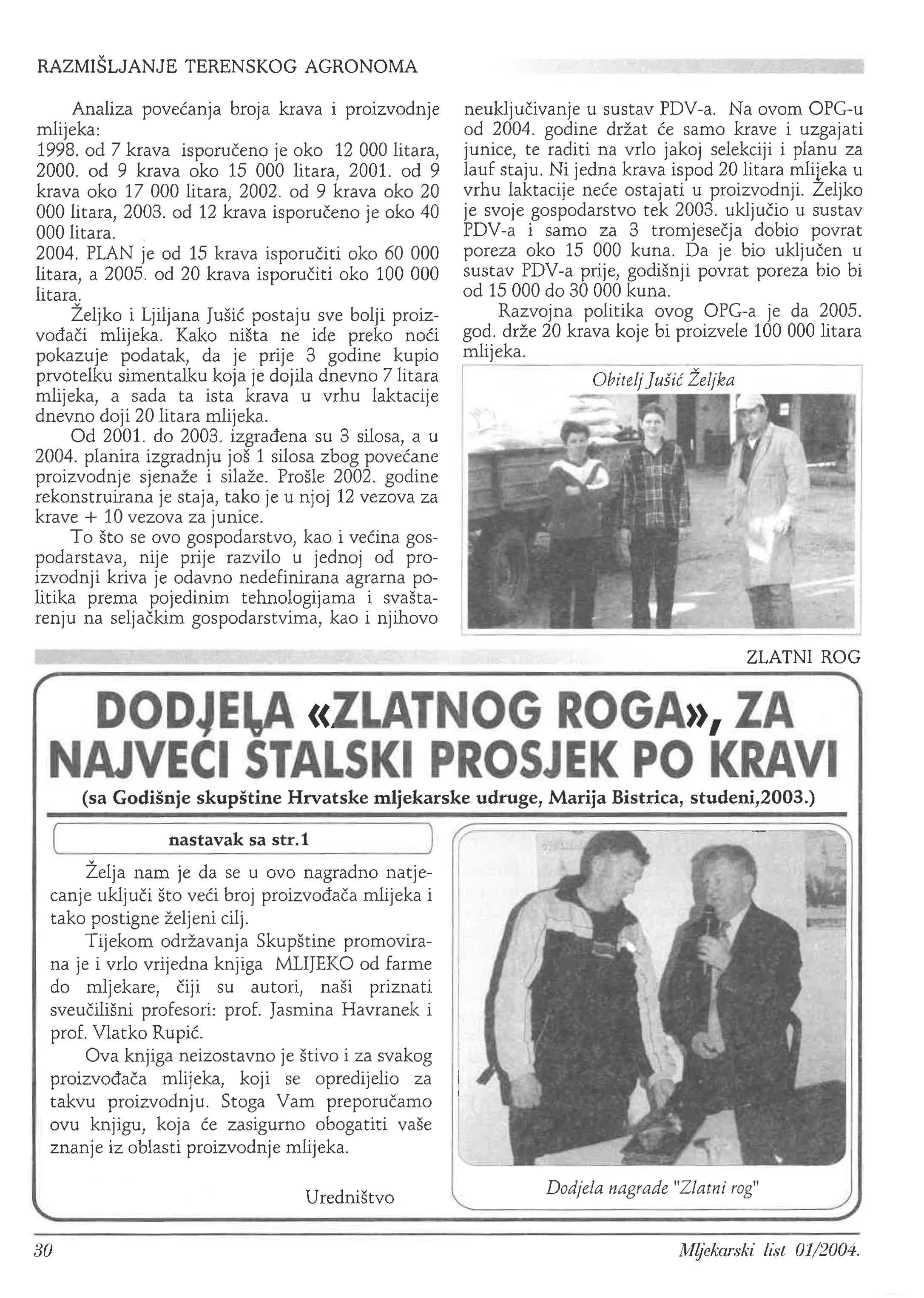 Na osnovu zadanih kriterija komisija je utvrdila da je u razdoblju od 01. 10. 2002. do 30. 09. 2003. godine mlijeka Mirka IMBRIŠAK, Staro Štefanje 80, iz Bjelovarska županije, 6750 litara mlijeka po kravi Ekstra i I. kvalitete, što predstavlja i štalski prosjek.