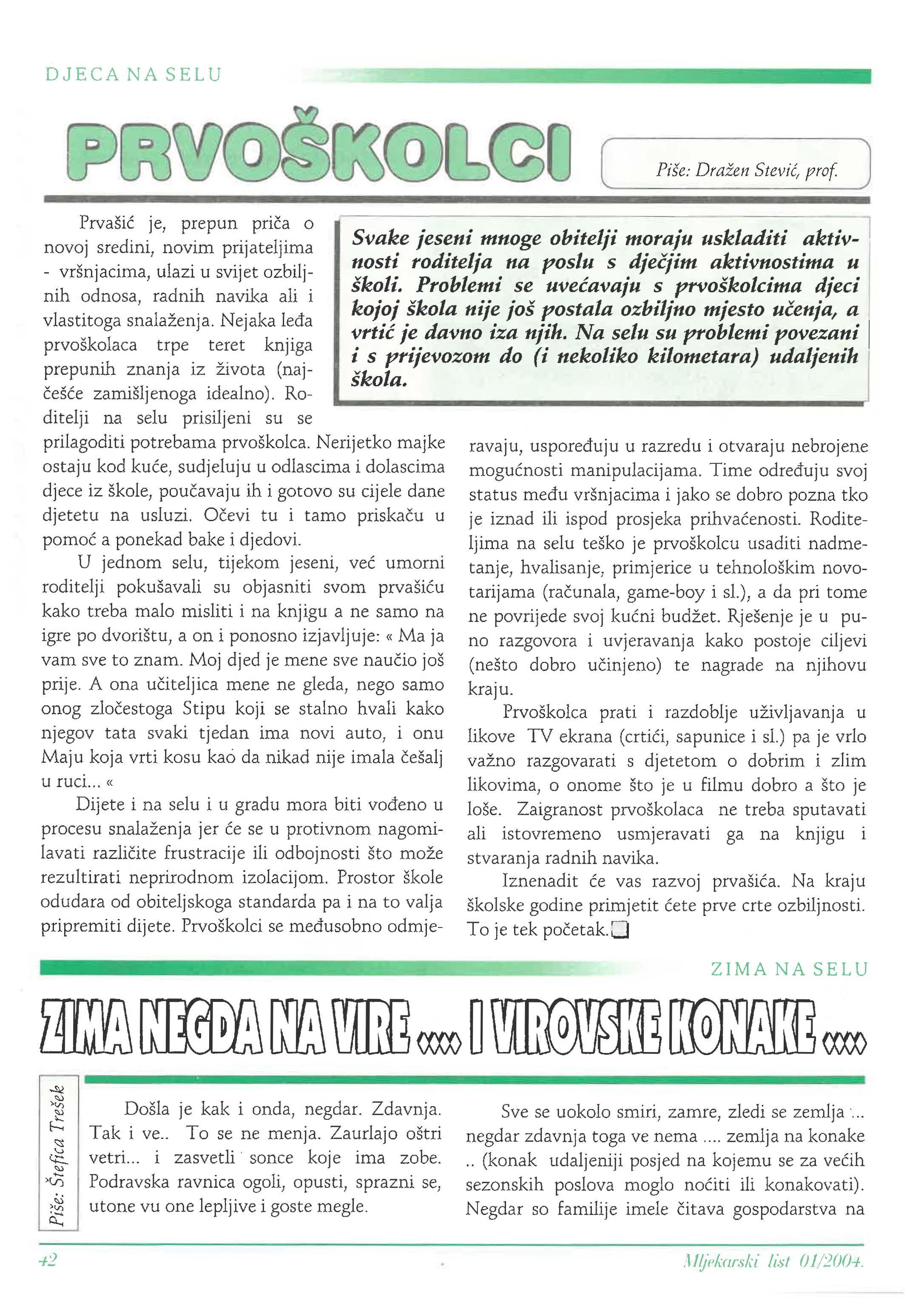 je, prepun o novoj sredini, novim prijateljima - vršnjacima, ulazi u svijet ozbiljnih odnosa, radnih navika ali i vlastitoga snalaženja. Nejaka prvoškolaca trpe teret knjiga prepunih znanja iz života (najzamišljenoga idealno). Roditelji na selu prisiljeni su se