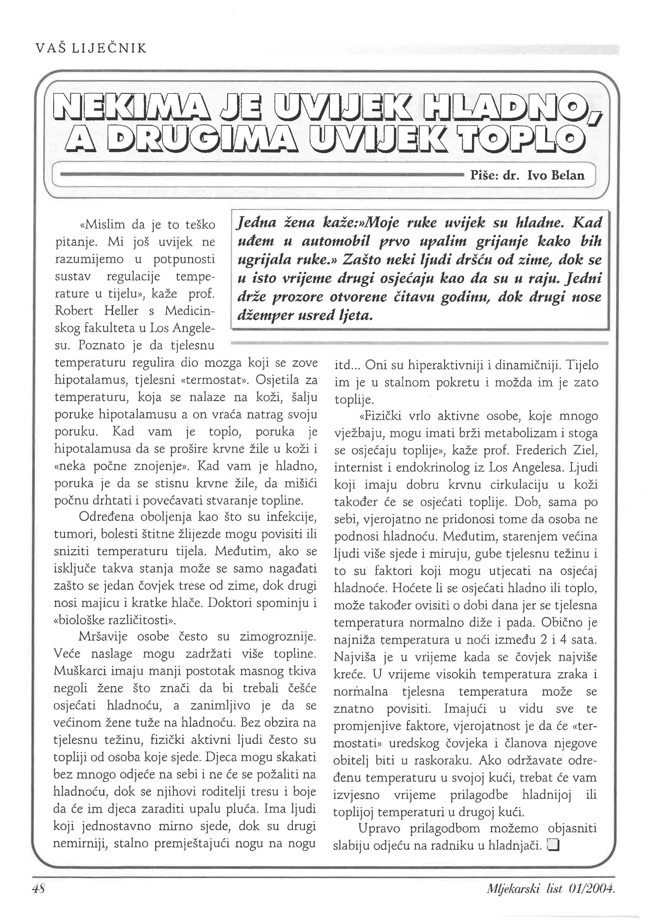 vrlo aktivne osobe, koje mnogo vježbaju, mogu imati brži metabolizam i stoga se toplije», kaže prof. Frederich Ziel, internist i endokrinolog iz Los Angelesa. Ljudi koji imaju dobru krvnu cirkulaciju u koži se toplije. Dob, sama po sebi, vjerojatno ne pridonosi tome da osoba ne podnosi starenjem ljudi više sjede i miruju, gube tjelesnu težinu i to su faktori koji mogu utjecati na li se hladno ili toplo, može ovisiti o dobi dana jer se tjelesna temperatura normalno diže i pada. je najniža temperatura u 2 i 4 sata. Najviša je u vrijeme kada se najviše U vrijeme visokih temperatura zraka i normalna tjelesna temperatura može se znatno pov1s1t1. u vidu sve te promjenjive faktore, vjerojatnost je da «termostati» uredskog i njegove obitelj biti u raskoraku. Ako održavate odretemperaturu u svojoj trebat vam izvjesno vrijeme prilagodbe hladnijoj ili toplijoj temperaturi u drugoj Upravo prilagodbom možemo objasniti slabiju na radniku u ::)