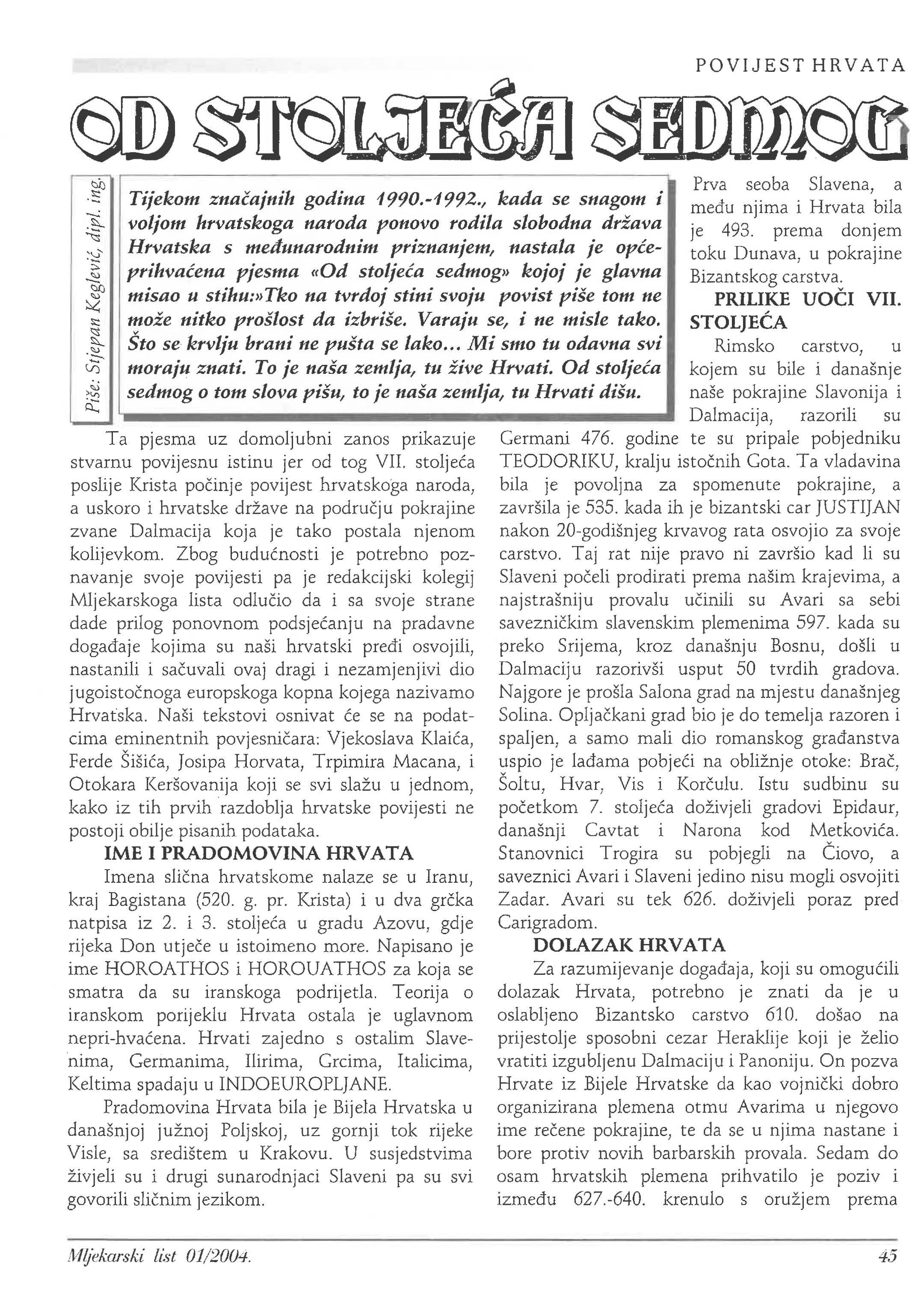Ta pjesma uz domoljubni zanos prikazuje Germani 476. godine te su pripale pobjedniku stvarnu povijesnu istinu jer od tog VII. TEODORIKU, kralju Gata. Ta vladavina poslije Krista povijest hrvatskoga naroda, bila je povoljna za spomenute pokrajine, a a uskoro i hrvatske države na pokrajine završila je 535. kada ih je bizantski car JUSTIJAN zvane Dalmacija koja je tako postala njenom nakon 20-godišnjeg krvavog rata osvojio za svoje kolijevkom. Zbog je potrebno poz- carstvo. Taj rat nije pravo ni završio kad li su navanje svoje povijesti pa je redakcijski kolegij Slaveni prodirati prema našim krajevima, a Mljekarskoga lista da i sa svoje strane najstrašniju provalu su Avari sa sebi dade prilog ponovnom na pradavne slavenskim plemenima 597. kada su kojima su naši hrvatski osvojili, preko Srijema, kroz današnju Basnu, došli u nastanili i ovaj dragi i nezamjenjivi dio Dalmaciju razorivši usput 50 tvrdih gradova. europskoga kopna kojega nazivamo Najgore je prošla Salona grad na mjestu današnjeg Hrvatska. Naši tekstovi osnivat se na podat- Solina. grad bio je do temelja razoren i cima eminentnih Vjekoslava spaljen, a samo mali dio romanskog Ferde Josipa Horvata, Trpimira Macana, i uspio je na obližnje otoke: Otokara Keršovanija koji se svi slažu u jednom, Šoltu, Hvar, Vis i Istu sudbinu su kako iz tih prvih razdoblja hrvatske povijesti ne 7. doživjeli gradovi Epidaur, postoji obilje pisanih podataka. današnji Cavtat i Narona kod