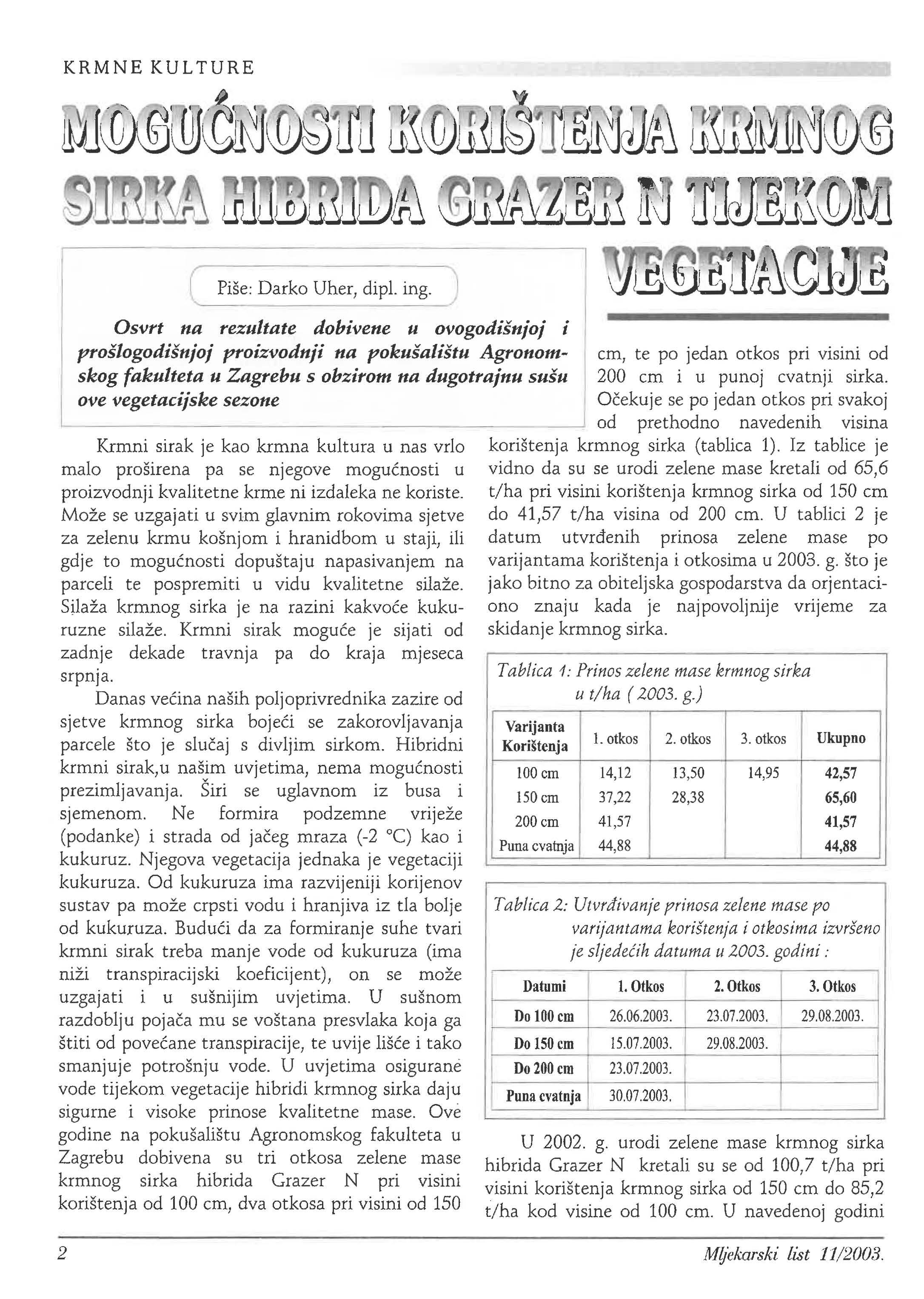 U 2002. g. urodi zelene mase krmnog sirka hibrida Grazer N kretali su se od 100,7 tiha pri visini korištenja krmnog sirka od 150 cm do 85,2 t/ha kod visine od 100 cm. U navedenoj godini