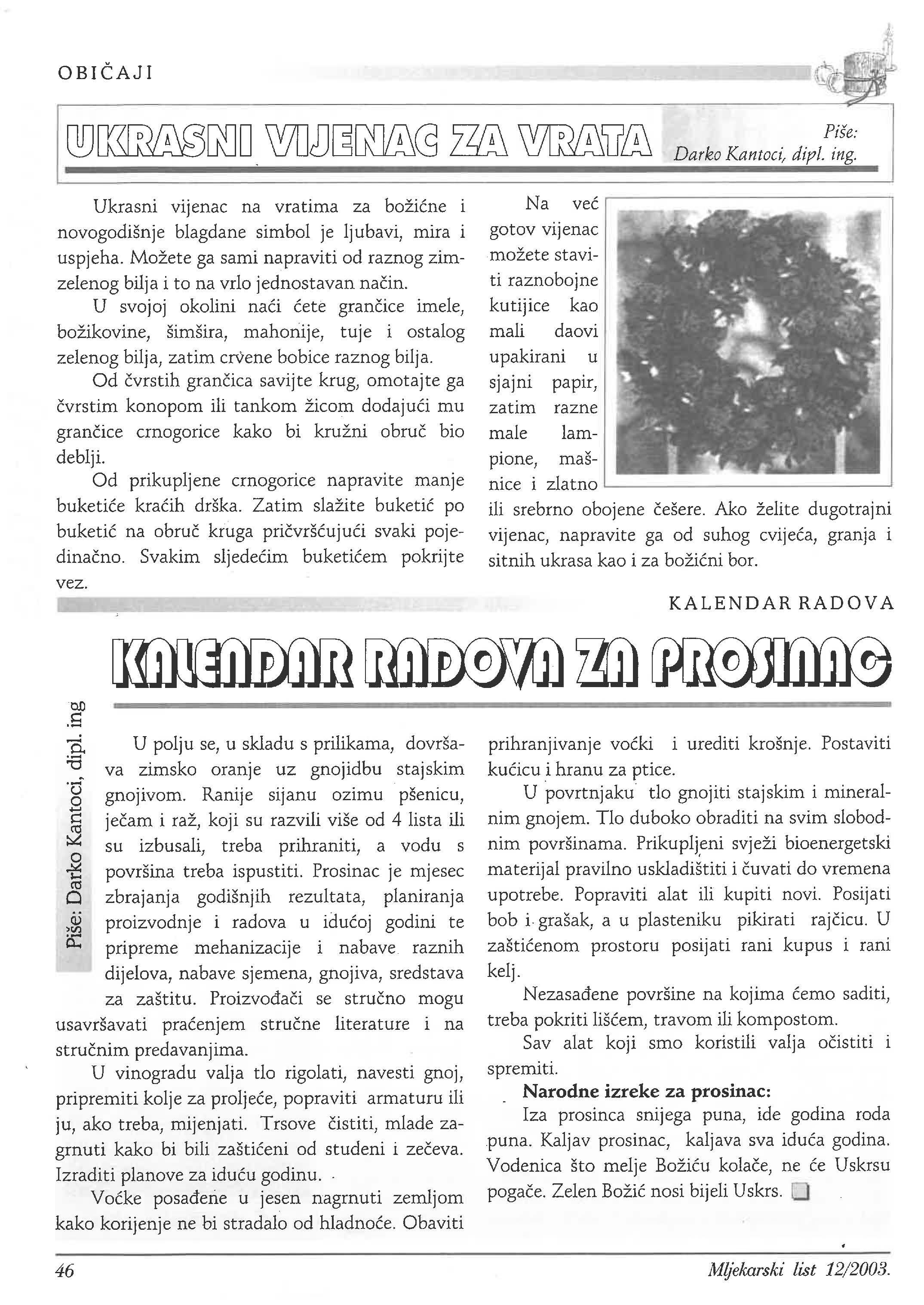 Piše: Darko Kantoct~dipl. ing. nice i zlatno '----------------' ili srebrno obojene Ako želite dugotrajni vijenac, napravite ga od suhog granja i sitnih ukrasa kao i za bor.