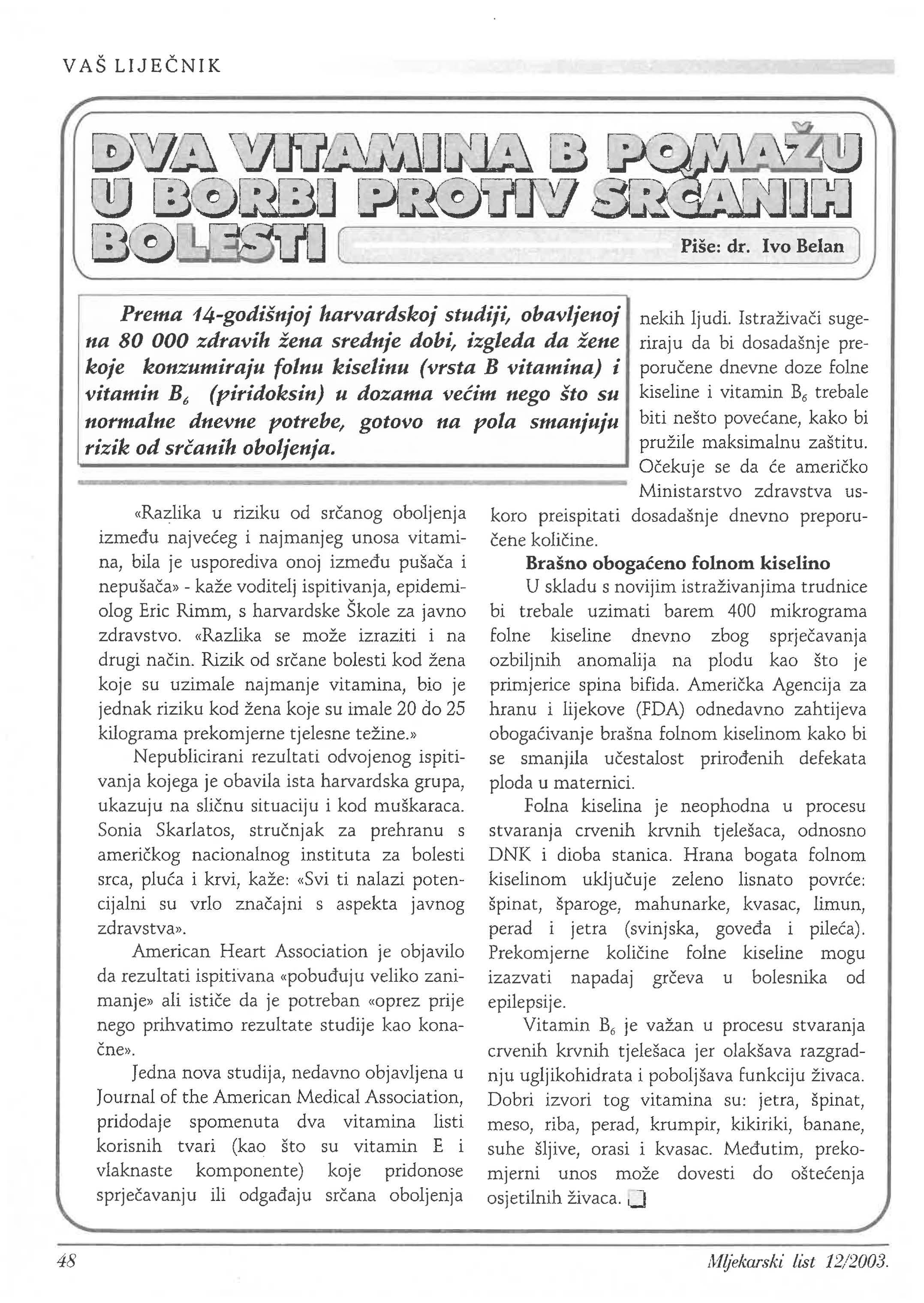 Prema 14-godišnjoj harvardskoj studiji, obavljenoj na 80 000 zdravih žena srednje dobi, izgleda da žene koje konzumiraju folnu kiselinu (vrsta B vitamina) i vitamin B6 (piridoksin) u dozama nego što su normalne dnevne potrebe, gotovo na pola smanjuju rizik od oboljenja.