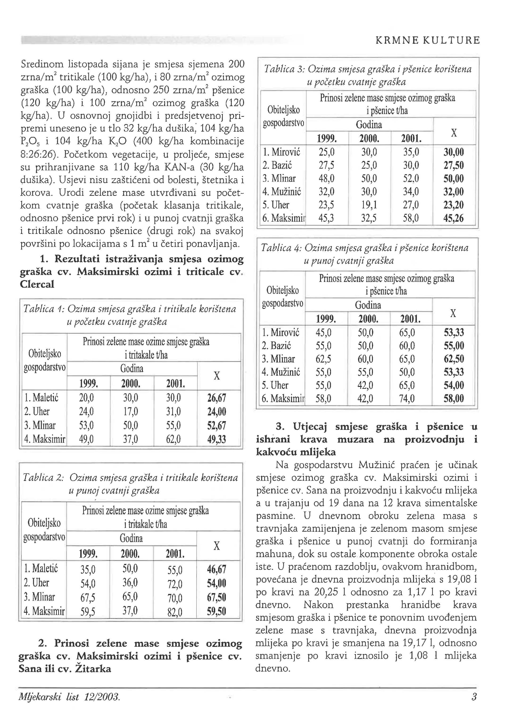 1. Rezultati istraživanja smjesa ozimog graška cv. Maksimirski ozimi i triticale cv. Clercal