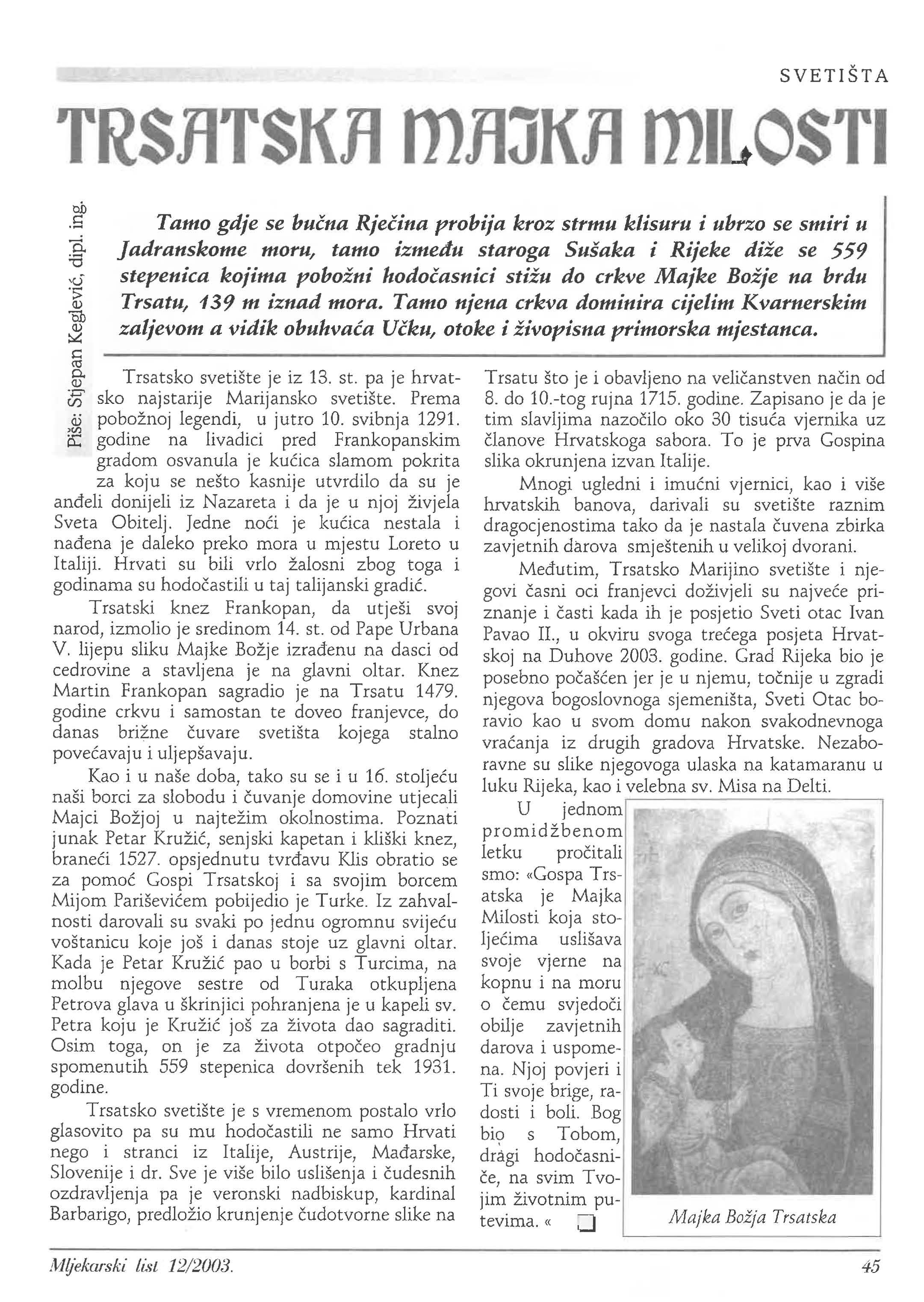 smo: «Gospa Trsatska je Majka Milosti koja stouslišava svoje vjerne na kopnu i na moru o obilje zavjetnih darova i uspomena. Njoj povjeri i Ti svoje brige, radosti i boli. Bog bio s Tobom, dr~gi