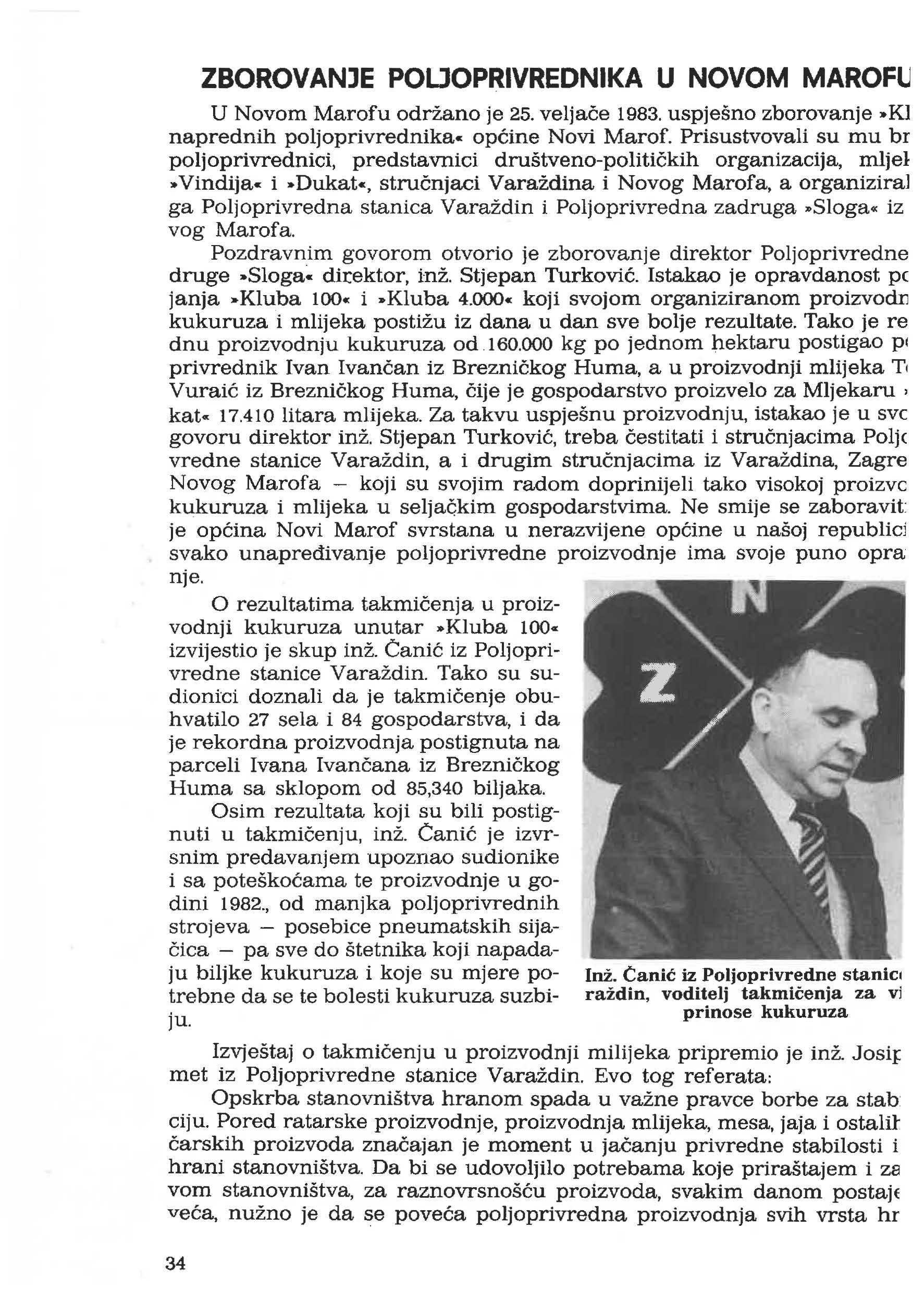 O rezultatima u proizvodnji kukuruza unutar »Kluba 100• izvijestio je skup inž. iz Poljoprivredne stanice Varaždin. Tako su sudionici doznali da je obuhvatilo 27 sela i 84 gospodarstva, i da je rekordna proizvodnja postignuta na parceli Ivana iz Huma sa sklopom od 85,340 biljaka. Osim rezultata koji su bili postignuti u inž. je izvrsnim predavanjem upoznao sudionike i sa te proizvodnje u godini 1982., od manjka poljoprivrednih strojeva - posebice pneumatskih sija- pa sve do štetnika koji napadaju biljke kukuruza i koje su mjere potrebne da se te bolesti kukuruza suzbiju.