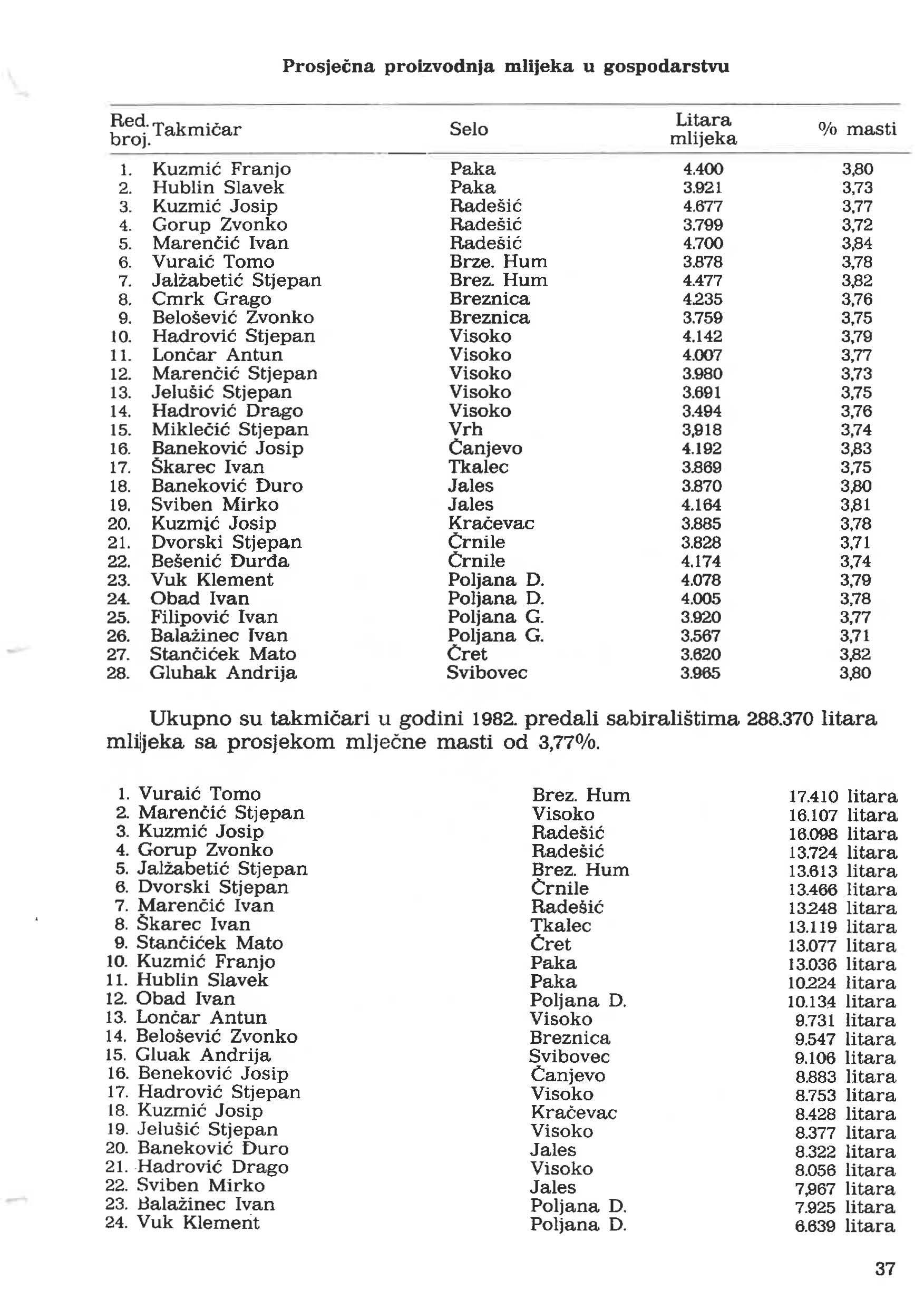 Ukupno su u godini 1982. predali sabiralištima 288.370 litara ml~jeka sa prosjekom masti od 3,770/o.