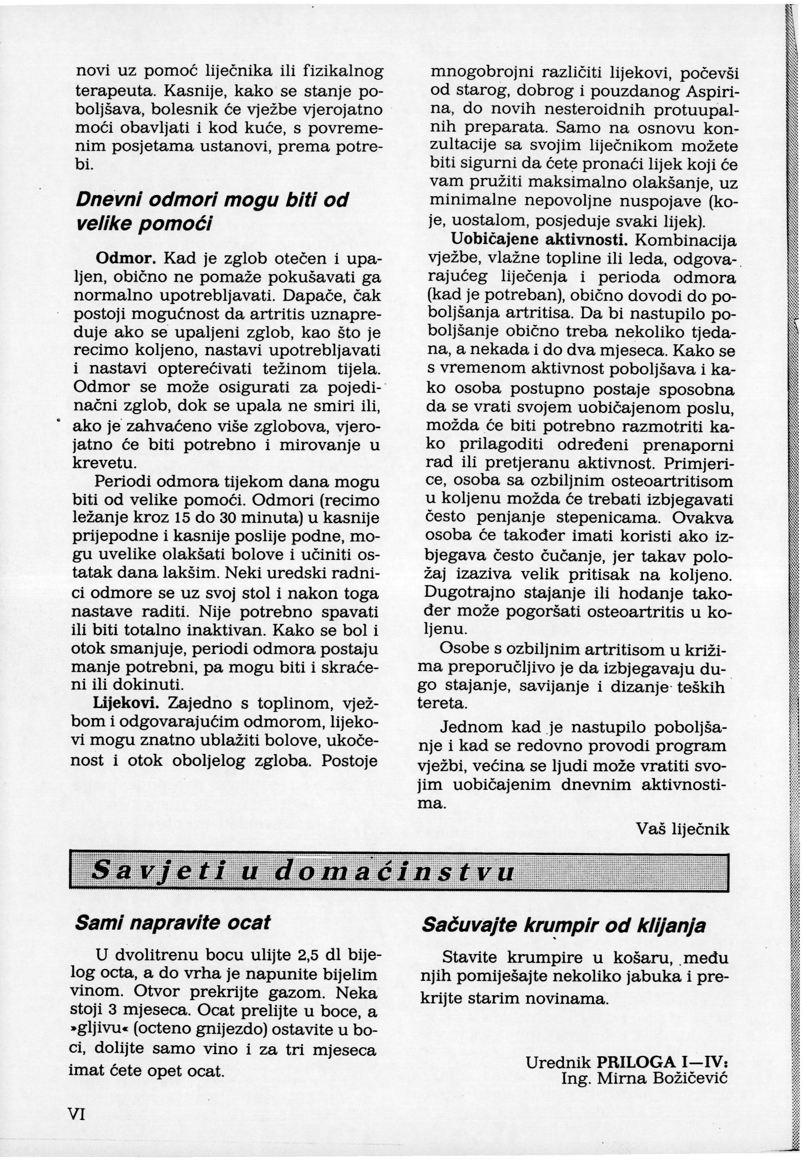 mnogobrojnirazličiti lijekovi,počevši od starog,dobrog i pouzdanogAspirina, do novih nesteroidnih protuupal- nih preparata. Samo na osnovu konzultacije sa svojimliječnikommožete biti sigurni da ćetepronaćilijekkoji će vam pružitimaksimalno olakšanje, uz minimalne nepovoljnenuspojave(koje,uostalom,posjedujesvaki lijek).