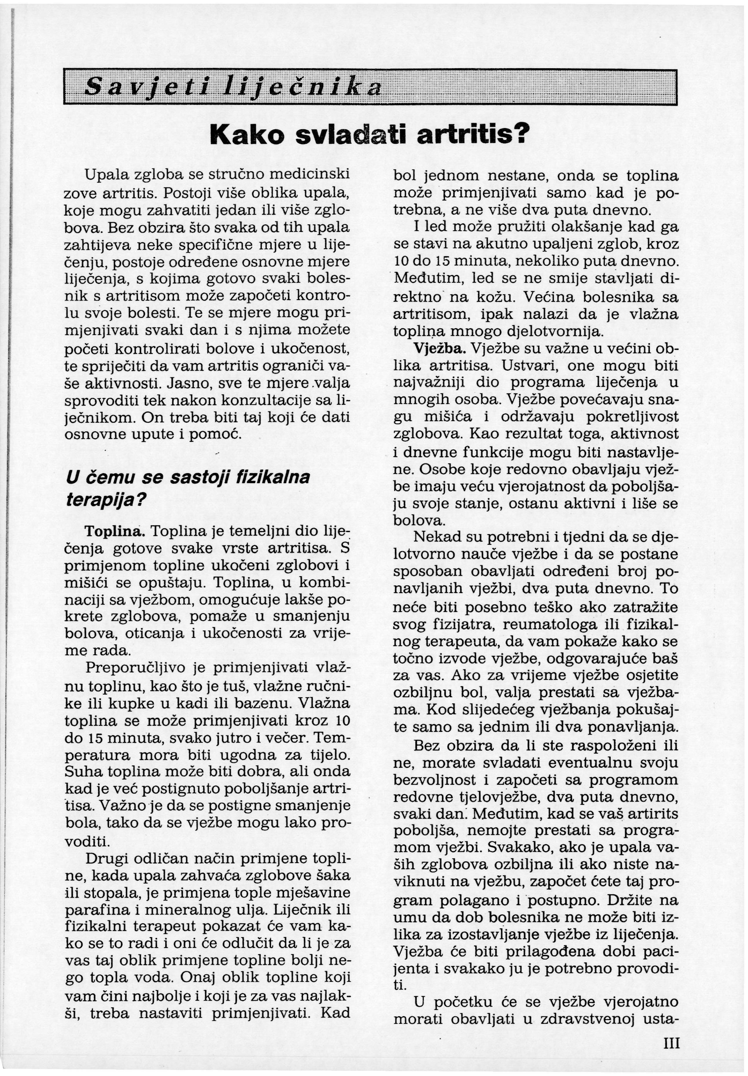 bol jednomnestane, onda se toplina može primjenjivati samo kad je potrebna, a ne više dva putadnevno I led može pružitiolakšanje kad ga se stavi na akutno upaljenizglob,kroz 10 do 15 minuta, nekoliko putadnevno Međutim,led se ne smijestavljati direktno na kožu Većina bolesnika sa artritisom, ipaknalazi da je vlažna toplinamnogo djelotvornija.