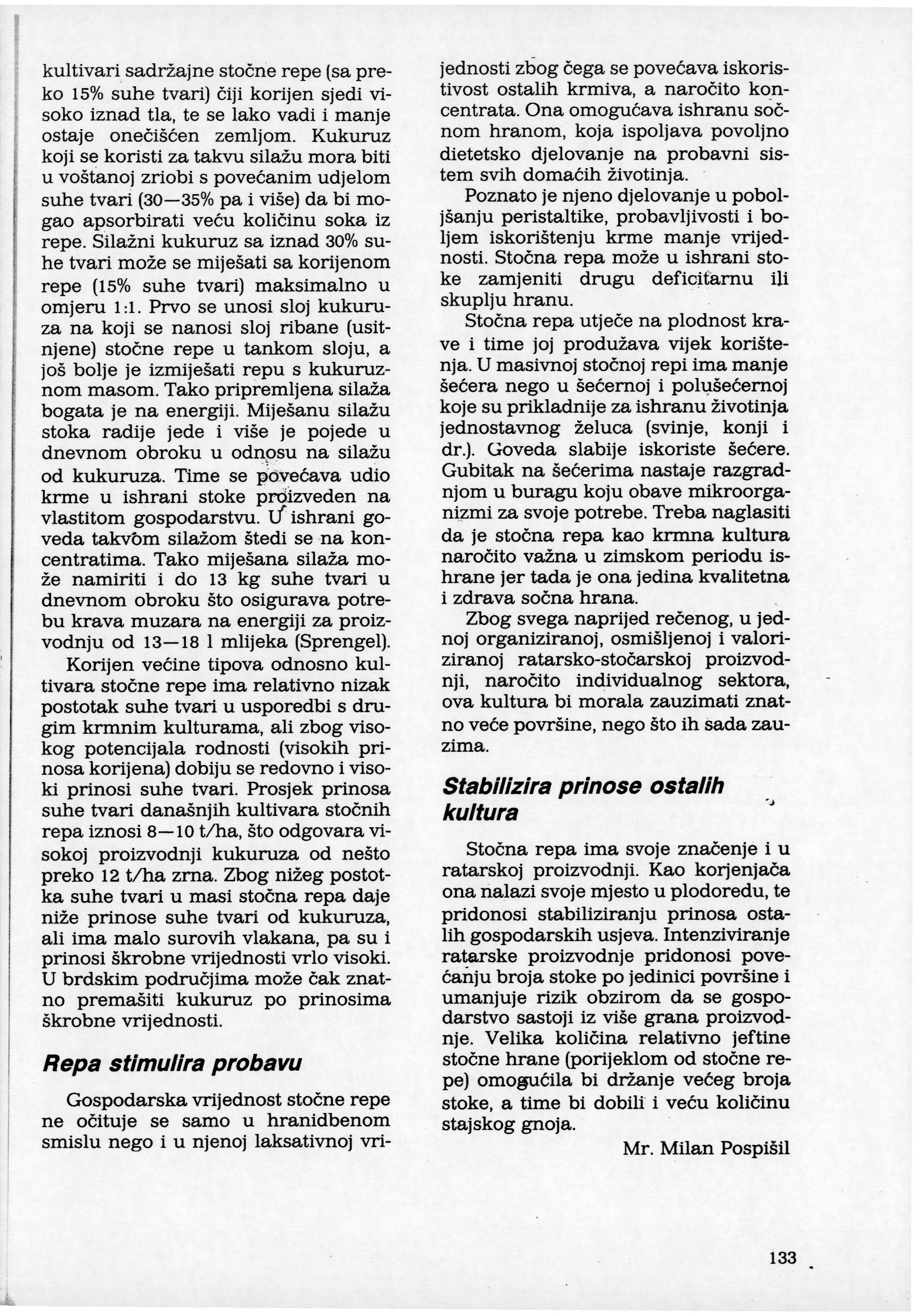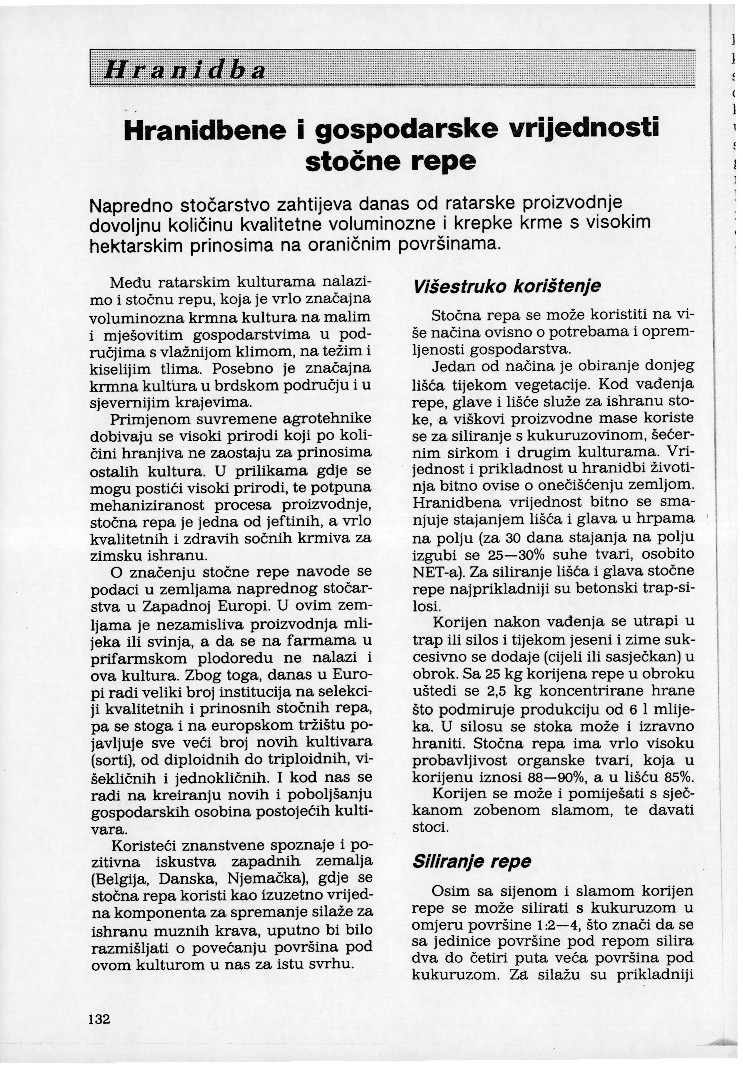 Koristeći znanstvene spoznaje i pozitivna iskustva zapadnihzemalja (Belgija,Danska,Njemačka),gdjese stočnarepa koristi kao izuzetno vrijedna komponenta za spremanjesilaže za ishranu muznih krava,uputnobi bilo razmišljati o povećanjupovršinapod ovom kulturom u nas za istu svrhu.