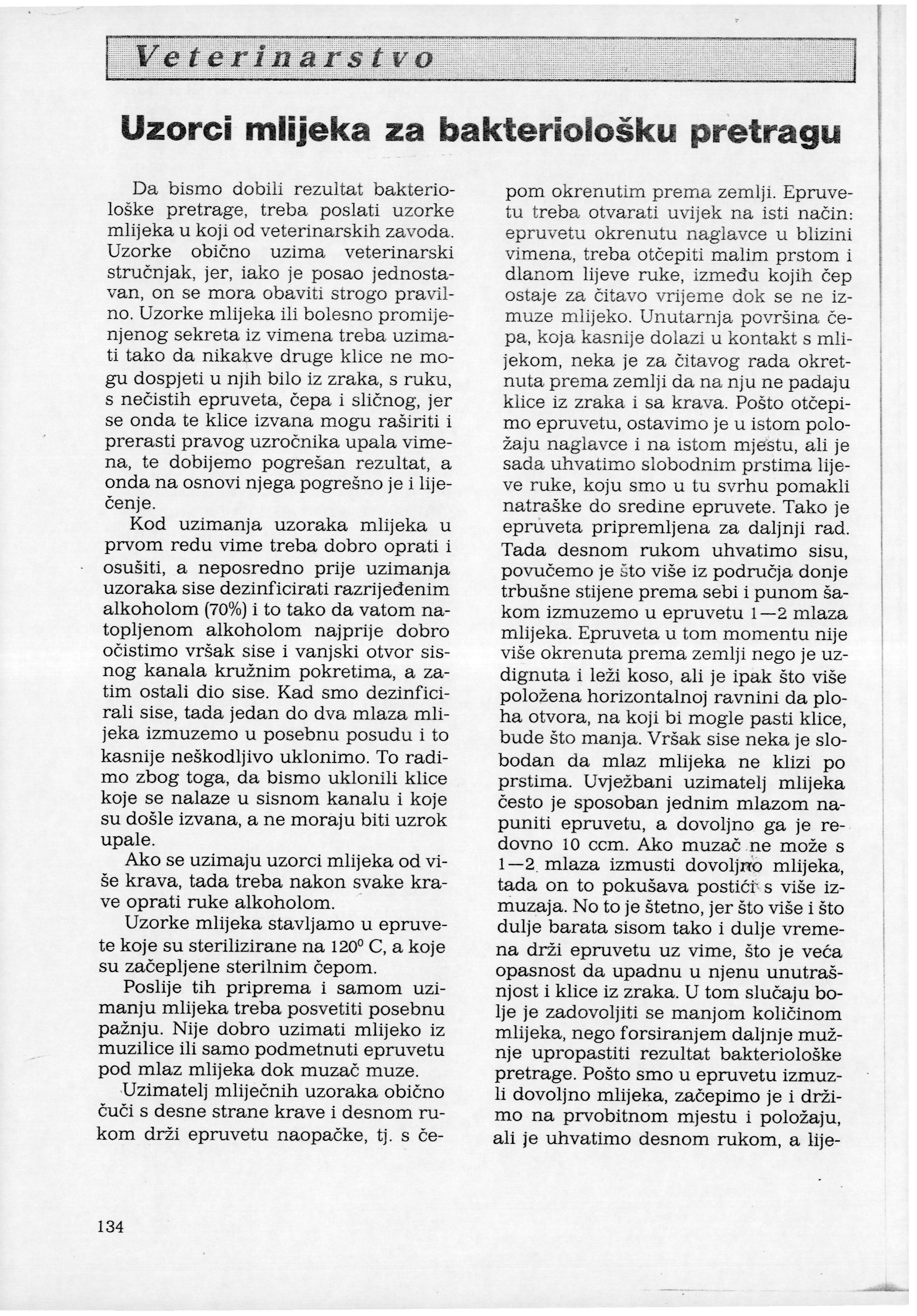 pom okrenutim prema zemlji.Epruvetu treba otvarati uvijek na isti način: epruvetuokrenutu naglavce u blizini vimena,treba otčepiti malim prstom i dlanom lijeveruke,između kojihčep ostaje za čitavo vrijemedok se ne izmuze mlijeko.Unutarnjapovršinačepa, kojakasnijedolazi u kontakt s mlijekom,neka jeza čitavograda okretnuta prema zemlji da na njune padaju klice iz zraka i sa krava. Pošto otčepimo epruvetu,ostavimo je u istom položajunaglavce i na istom mjestu, ali je sada uhvatimo slobodnim prstimalijeve ruke,kojusmo u tu svrhu pomakli natraške do sredine epruvete. Tako je epruvetapripremljena za daljnji rad Tada desnom rukom uhvatimo sisu, povučemoješto više iz područjadonje trbušne stijeneprema sebi i punom šakom izmuzemo u epruvetu 1 2 mlaza mlijeka.Epruveta u tom momentu nije više okrenuta prema zemljinego jeuzdignuta i leži koso,ali jeipakšto više položenahorizontalnoj ravnini da plo- ha otvora, na koji bi moglepastiklice, bude što manja.Vršak sise neka jeslobodan da mlaz mlijeka ne klizi po prstima.Uvježbaniuzimateljmlijeka često jesposobanjednimmlazom naPunitiepruvetu, a dovoljno ga jeredovno 10 ccm Ako muzač ne može s 1 2 mlaza izmusti dovoljnomlijeka, tadaon to pokušavapostići s više izmuzaja. No to ještetno,jeršto više i što duljebarata sisom tako i duljevremena drži epruvetu uz vime,što jeveća opasnost da upadnuu njenuunutrašnjost i klice iz zraka U tom slučaju boljejezadovoljiti se manjom količinom mlijeka, nego forsiranjemdaljnje mužnjeupropastitirezultat bakteriološke pretrage.Pošto smo u epruvetuizmuzli dovoljnomlijeka,začepimojei držimo na prvobitnommjestu i položaju, ali jeuhvatimo desnom rukom,a lije-