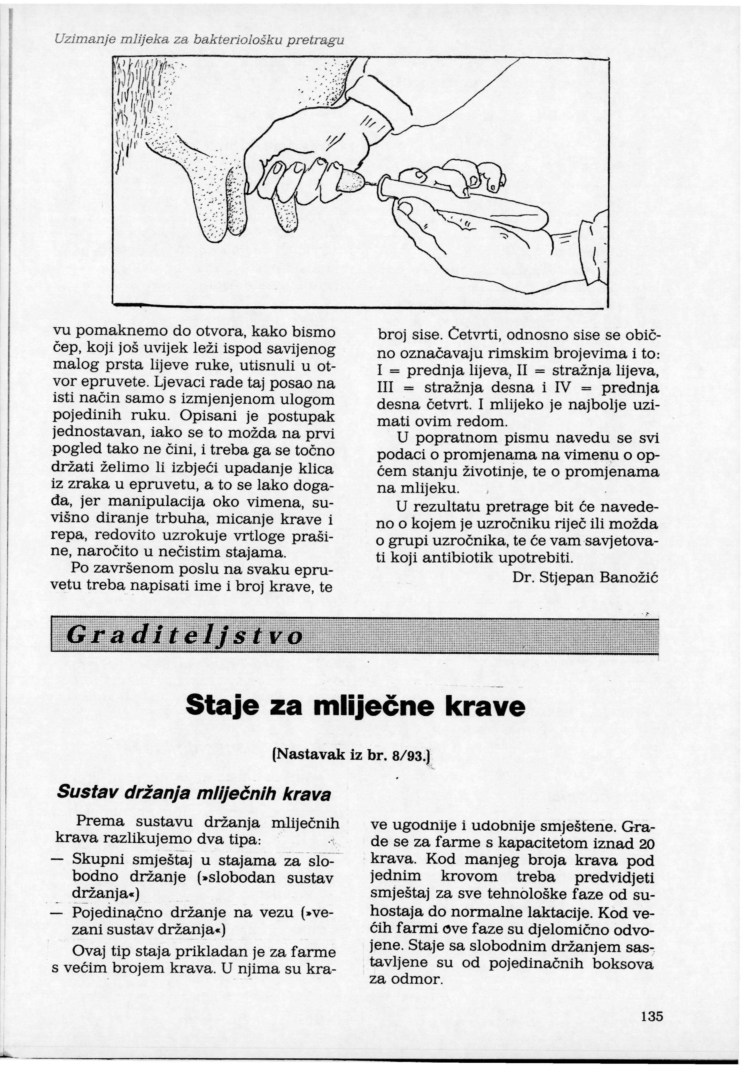 vu pomaknemo do otvora, kako bismo čep,kojijošuvijekleži ispodsavijenogmalogprstalijeveruke,utisnuli u otvor epruvete.Ljevacirade tajposao na isti način samo s izmjenjenomulogom pojedinihruku. jednostavan,Opisanijepostupak iako se to možda na prvi pogledtako ne čini, i treba ga se točno držati želimo li izbjećiupadanjeklica iz zraka u epruvetu, a to se lako događa,jermanipulacija oko vimena,suvišno diranjetrbuha,micanjekrave i repa, redovito uzrokujevrtlogeprašine, naročito u nečistim stajama.