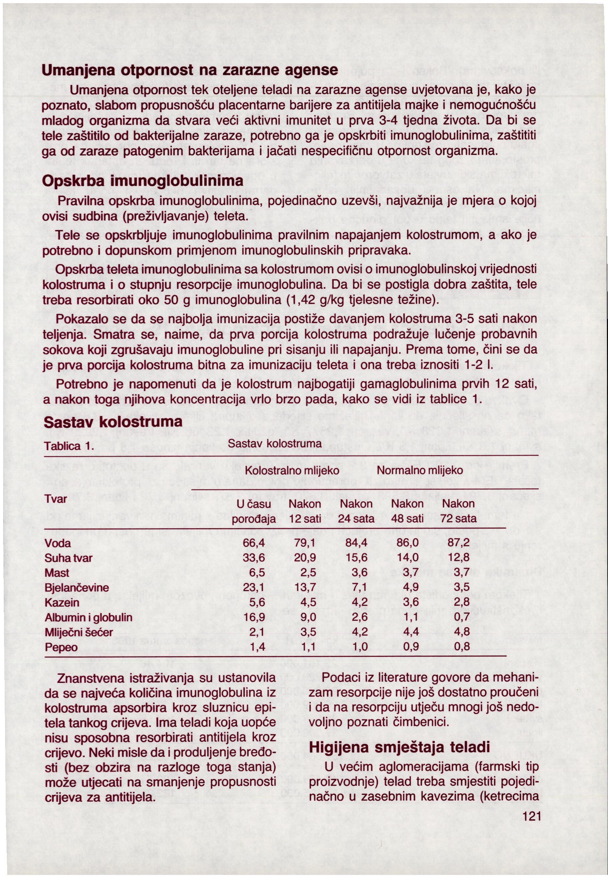 Potrebno je napomenuti da je kolostrum najbogatijigamaglobulinima prvih 12 sati, a nakon toga njihova koncentracijavrlo brzo pada, kako se vidi iz tablice 1