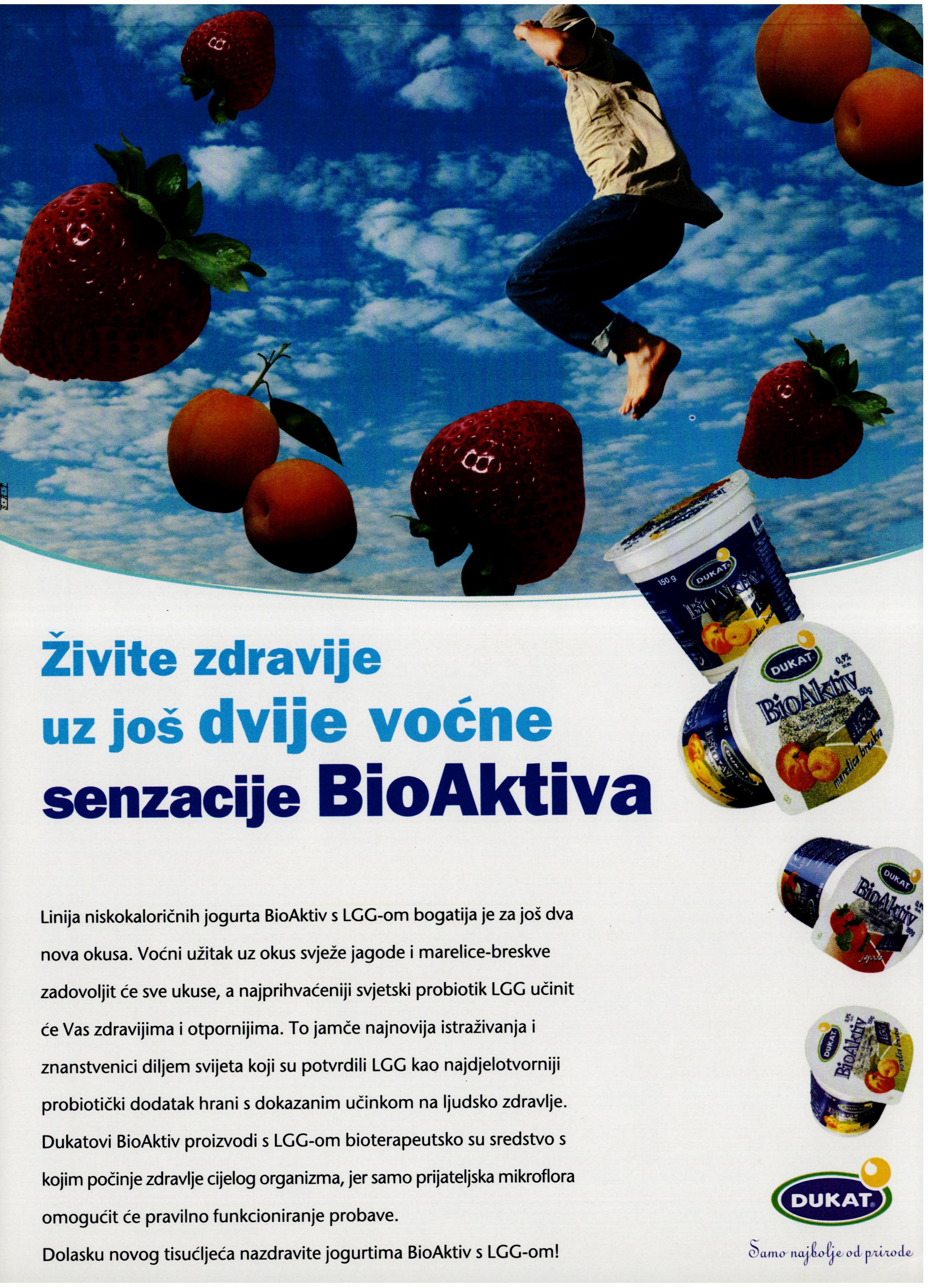 LinijaniskokaloričnihjogurtaBioAktiv s LGG-om bogatija jeza jošdva nova okusa.Voćniužitak uz okus svježejagode i marelicebreskve zadovoljit će sve ukuse, a najprihvaćenijisvjetskiprobiotik LGG učinit će Vas zdravijima i otpornijima. To jamčenajnovijaistraživanja i znanstvenicidiljemsvijetakoji su potvrdili LGG kao najdjelotvorniji probiotičkidodatakhrani s dokazanim učinkom na ljudskozdravlje.