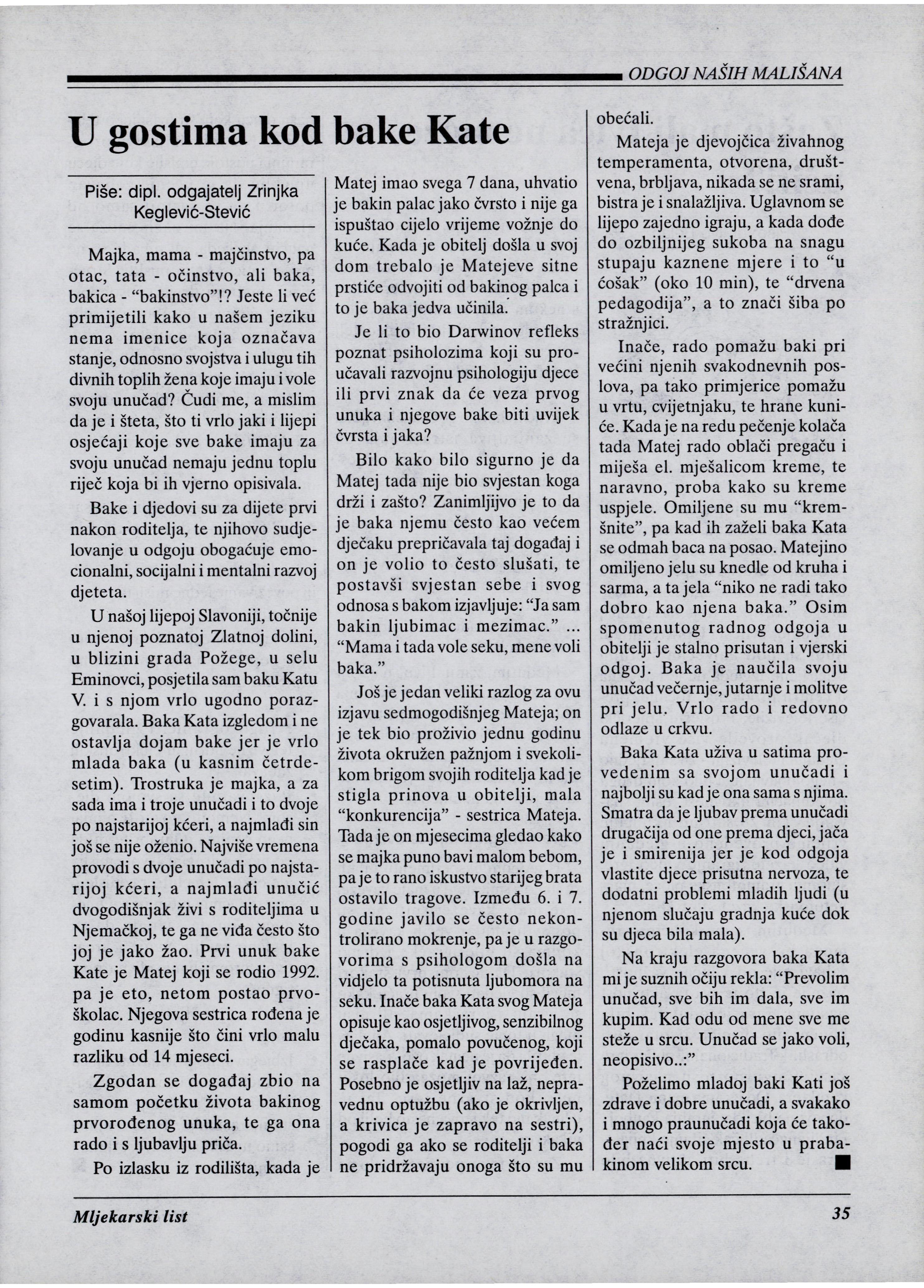 Inače,rado pomažubaki pri većini njenihsvakodnevnih poslova, pa tako primjericepomažu u vrtu, cvijetnjaku, te hrane kuniće Kadajena redu pečenjekolača tada Matejrado oblači pregaču i miješael. mješalicomkreme,te naravno, probakako su kreme uspjele.Omiljene su mu “kremšnite", pa kad ih zaželi baka Kata se odmah baca na posao. Matejino omiljenojelu su knedle od kruha i sarma, a ta jela“niko ne radi tako dobro kao njenabaka." Osim spomenutogradnogodgoja u obitelji jestalno prisutan i vjerski odgoj.Baka je naučila svoju unučad večernje,jutarnje i molitve prijelu.Vrlo rado i redovno odlaze u crkvu.