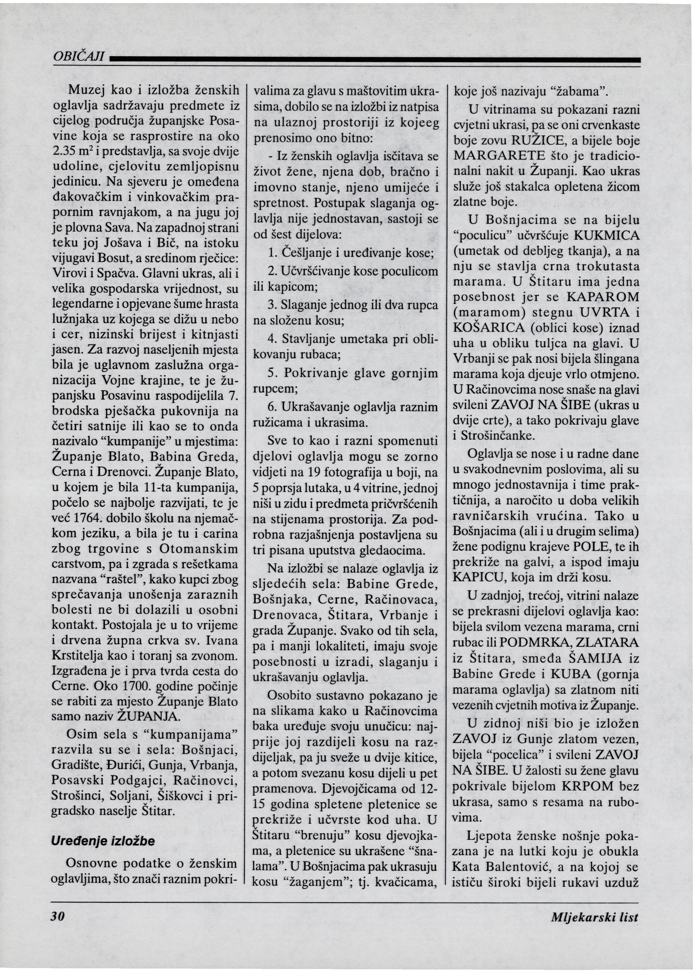 Sve to kao i razni spomenuti djelovioglavljamogu se zorno vidjeti na 19 fotografija u boji, na 5 poprsjalutaka, u 4 vitrine,jednoj niši u zidu i predmetapričvršćenih na stijenamaprostorija. Za podrobna razjašnjenjapostavljena su tri pisanauputstvagledaocima. Na izložbi se nalaze oglavlja iz sljedećihsela: Babine Grede, Bošnjaka,Cerne, Račinovaca, Drenovaca, Štitara,Vrbanje i gradaŽupanje.Svako od tih sela, pa i manjilokaliteti,imajusvoje posebnosti u izradi,slaganju i ukrašavanjuoglavlja.