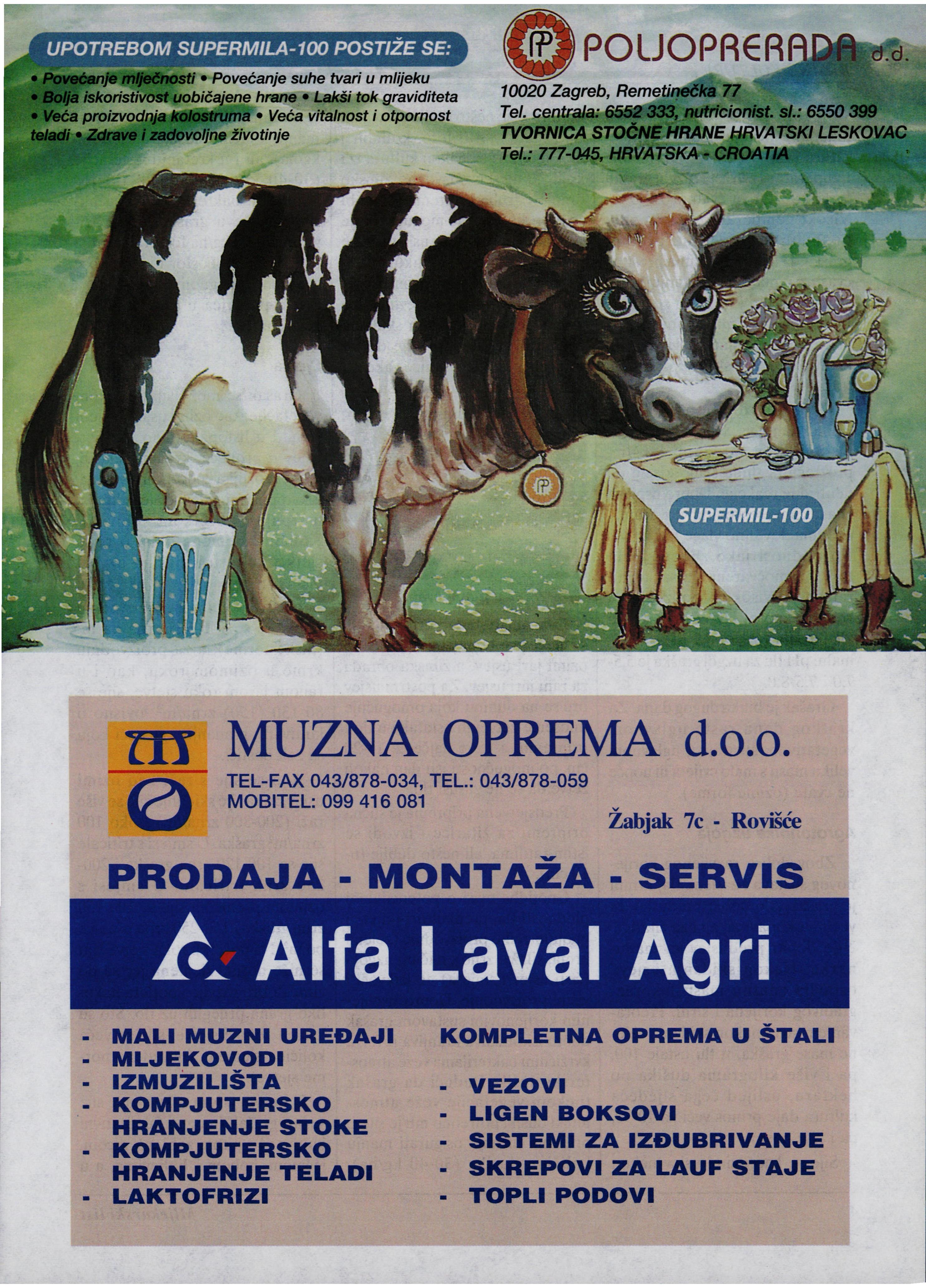 # UPOTREBOM SUPERMILA-100 POSTIŽESE: POLJOPRERARAzs Povećanje suhe tvari u mlijeku hranejsiLakšitokgraviditeta 10020 Zagreb,Remetinečka. 77 Tel centrala: so sl : TVORNICA STI IE HRVATSKILESKO! Tel.: 777045, HRVA ZEXY MUZNA OPREMA d.o.o. TELFAX 043/878034, TEL.:043/878059 (O) MOBITEL: 099 416 081 u : Žabjak 7c - Rovišće PRODAJAMONTAŽASERVIS MALI MUZNI UREĐAJI KOMPLETNA OPREMA U ŠTALI - MLJEKOVODI - IZMUZILIŠTA VEZOVI HRANJENJE STOKE LIGEN BOKSOVI KOMPJUTERSKO - SISTEMI ZA IZĐUBRIVANJE HRANJENJE TELADI - SKREPOVI ZA LAUF STAJE - LAKTOFRIZI - TOPLI PODOVI