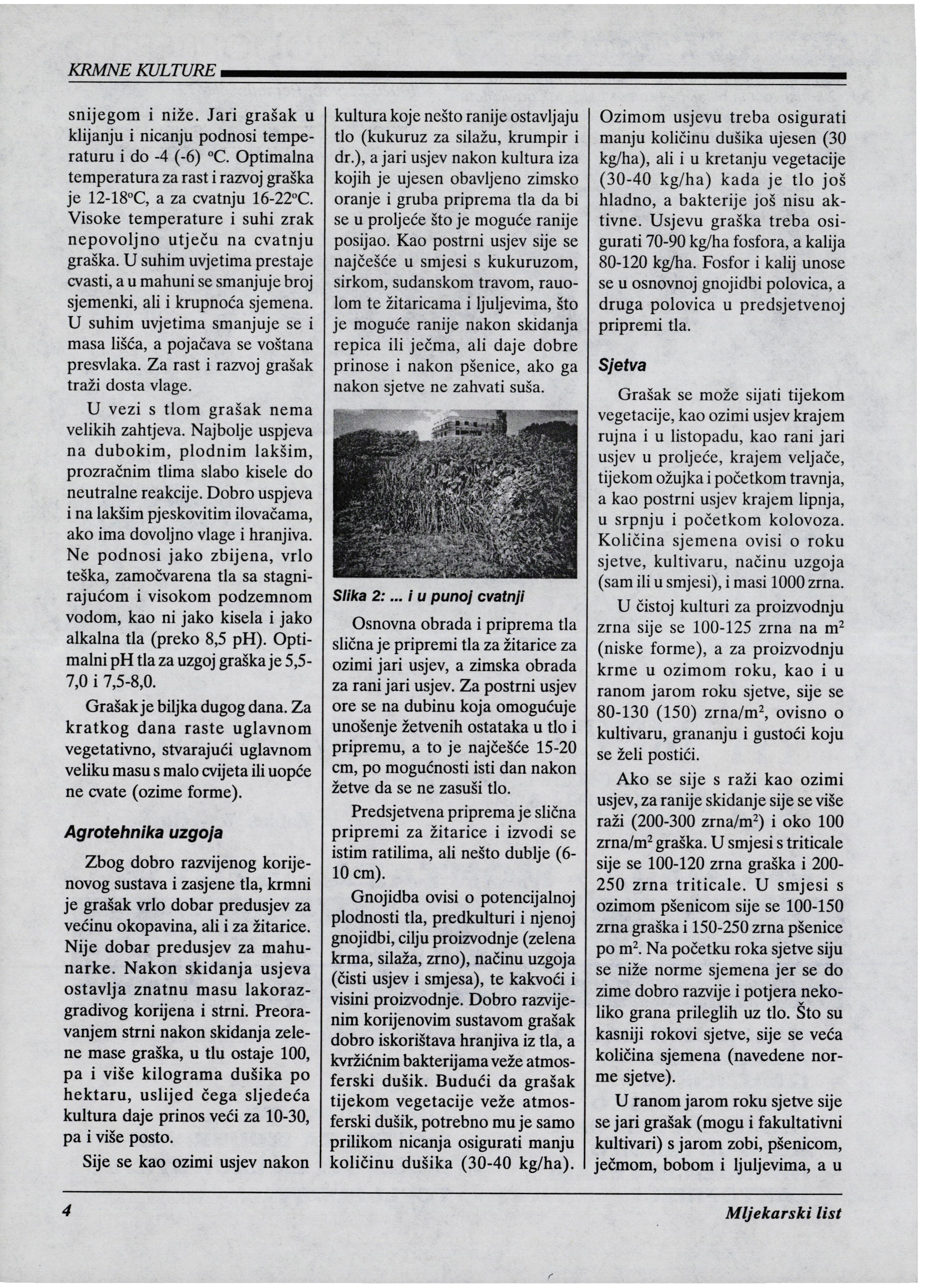 Smjesaozime pšenice i krmnog graškadajeviši prinoszelene mase i suhe tvari od smjesegraška s raži zbogkasnijegkorištenja i većeg udjelagraška u masi. Osim toga, dolazi za korištenje iza smjese s raži, pa se tako nadovezuje na tu smjesukorištenjem u zelenom stanju. Ona se i najdužemože koristiti jergrašakdugocvate, a cvatnja mu uglavnomduže traje (slika2).Ova smjesajena Agronomskom fakultetu u Zagrebu dala urod zelene mase u količini od 55,65do 65,20t/haodnosno 12,62do 17,44t/hasuhe tvari (Štafa i sur 1998.).