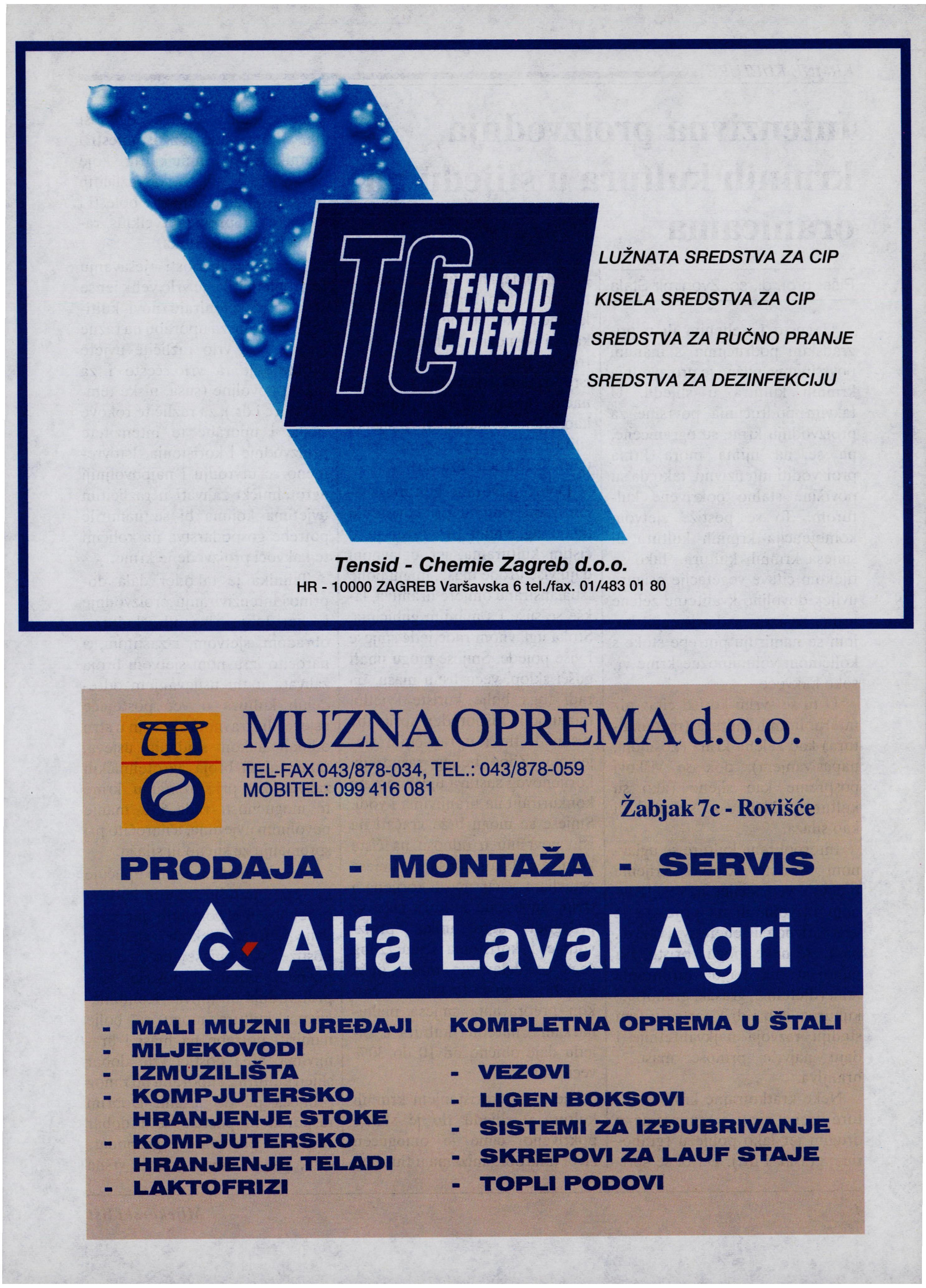 LUŽNATA SREDSTVA ZA CIP [7 M 3 |11] KISELA SREDSTVA ZA CIP C H,|d1] I| SREDSTVA ZA RUČNO PRANJE SREDSTVA ZA DEZINFEKCIJU Tensid - Chemie Zagreb d.o.o. HR - 10000 ZAGREB Varšavska 6 tel /fax 01/483 01 80 TELFAX 043/878034, TEL.:043/878059 MOBITEL:099416081 Žabjak 7c - Rovišće MALI MUZNI UREĐAJI KOMPLETNA OPREMA U ŠTALI - MLJEKOVODI - IZMUZILIŠTA - VEZOVI - KOMPJUTERSKO - LIGEN BOKSOVI HRANJENJE STOKE - KOMPJUTERSKO - SISTEMI ZA IZĐUBRIVANJE HRANJENJE TELADI - SKREPOVI ZA LAUF STAJE - LAKTOFRIZI - TOPLI PODOVI