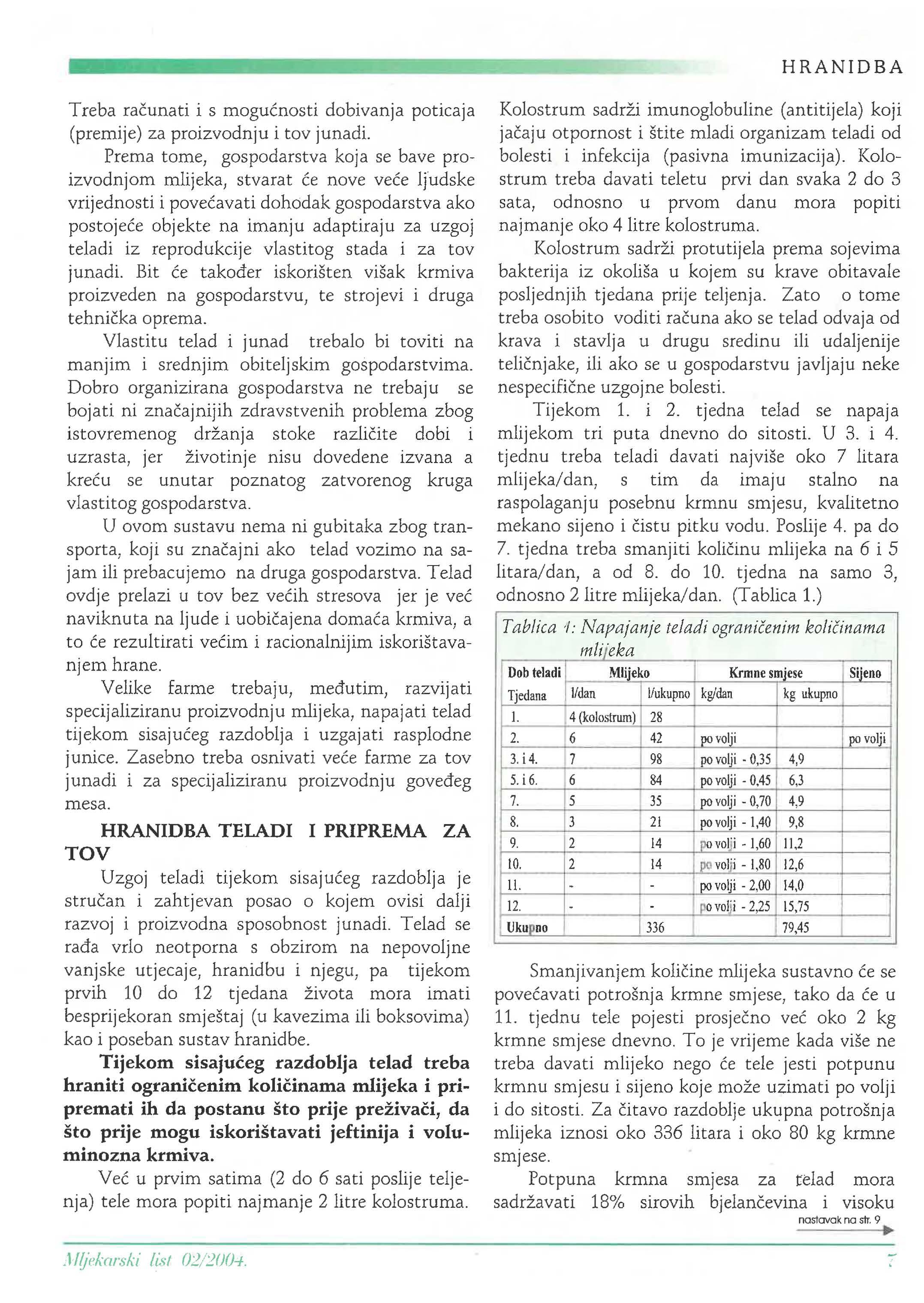 Tijekom 1. i 2. tjedna telad se napaja mlijekom tri puta dnevno do sitosti. U 3. i 4. tjednu treba teladi davati najviše oko 7 litara mlijeka/dan, s tim da imaju stalno na raspolaganju posebnu krmnu smjesu, kvalitetno mekana sijeno i pitku vodu. Poslije 4. pa do 7. tjedna treba smanjiti mlijeka na 6 i 5 litara/dan, a od 8. do 10. tjedna na samo 3, odnosno 2 litre mlijeka/dan. (Tablica 1.)