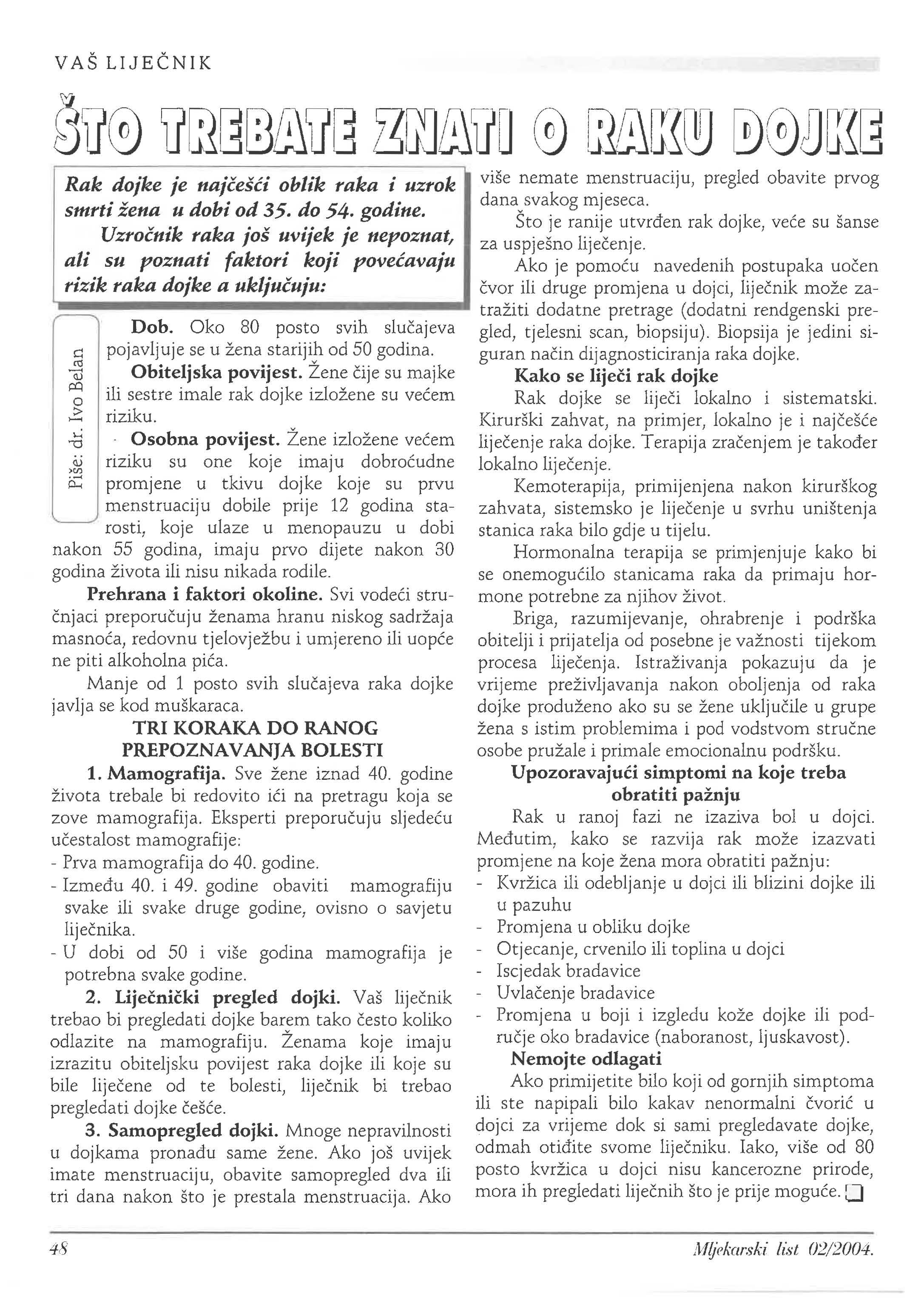 2. pregled dojki. Vaš - bradavice trebao bi pregledati dojke barem tako koliko - Promjena u boji i izgledu kože dojke ili pododlazite na mamografiju. Ženama koje imaju oko bradavice (naboranost, ljuskavost). izrazitu obiteljsku povijest raka dojke ili koje su Nemojte odlagati bile od te bolesti, bi trebao Ako primijetite bilo koji od gornjih simptoma pregledati dojke ili ste napipali bilo kakav nenormalni u