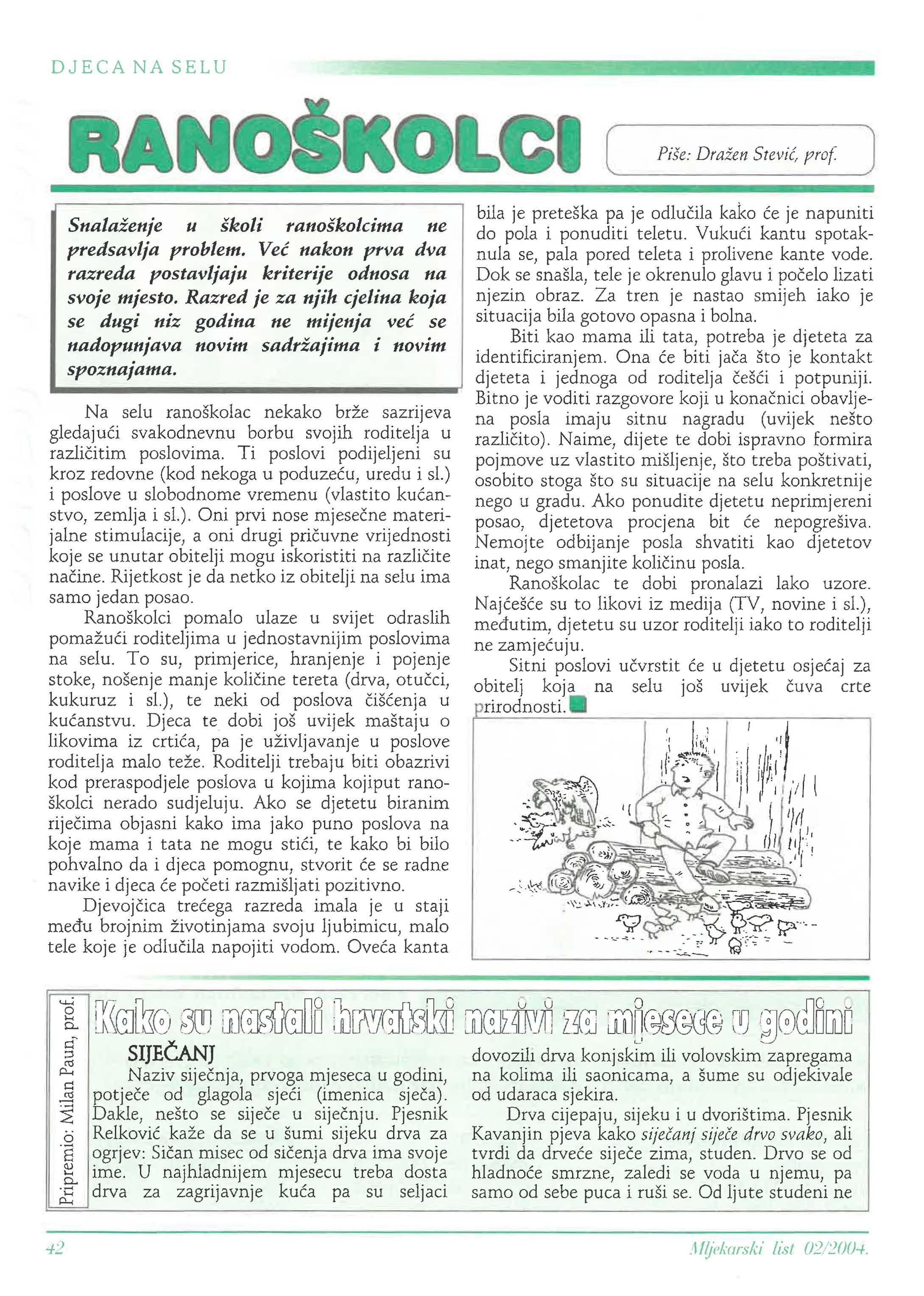 Ranoškolci pomalo ulaze u svijet odraslih roditeljima u jednostavnijim poslovima na selu. To su, primjerice, hranjenje i pojenje stoke, nošenje manje tereta (drva, kukuruz i sl.), te neki od poslova u Djeca te dobi još uvijek maštaju o likovima iz pa je uživljavanje u poslove roditelja malo teže. Roditelji trebaju biti obazrivi kod preraspodjele poslova u kojima kojiput ranoškolci nerado sudjeluju. Ako se djetetu biranim objasni kako ima jako puno poslova na koje mama i tata ne mogu te kako bi bilo pohvalno da i djeca pomognu, stvorit se radne navike i djeca razmišljati pozitivno. razreda imala je u staji brojnim životinjama svoju ljubimicu, malo tele koje je napojiti vodom. kanta