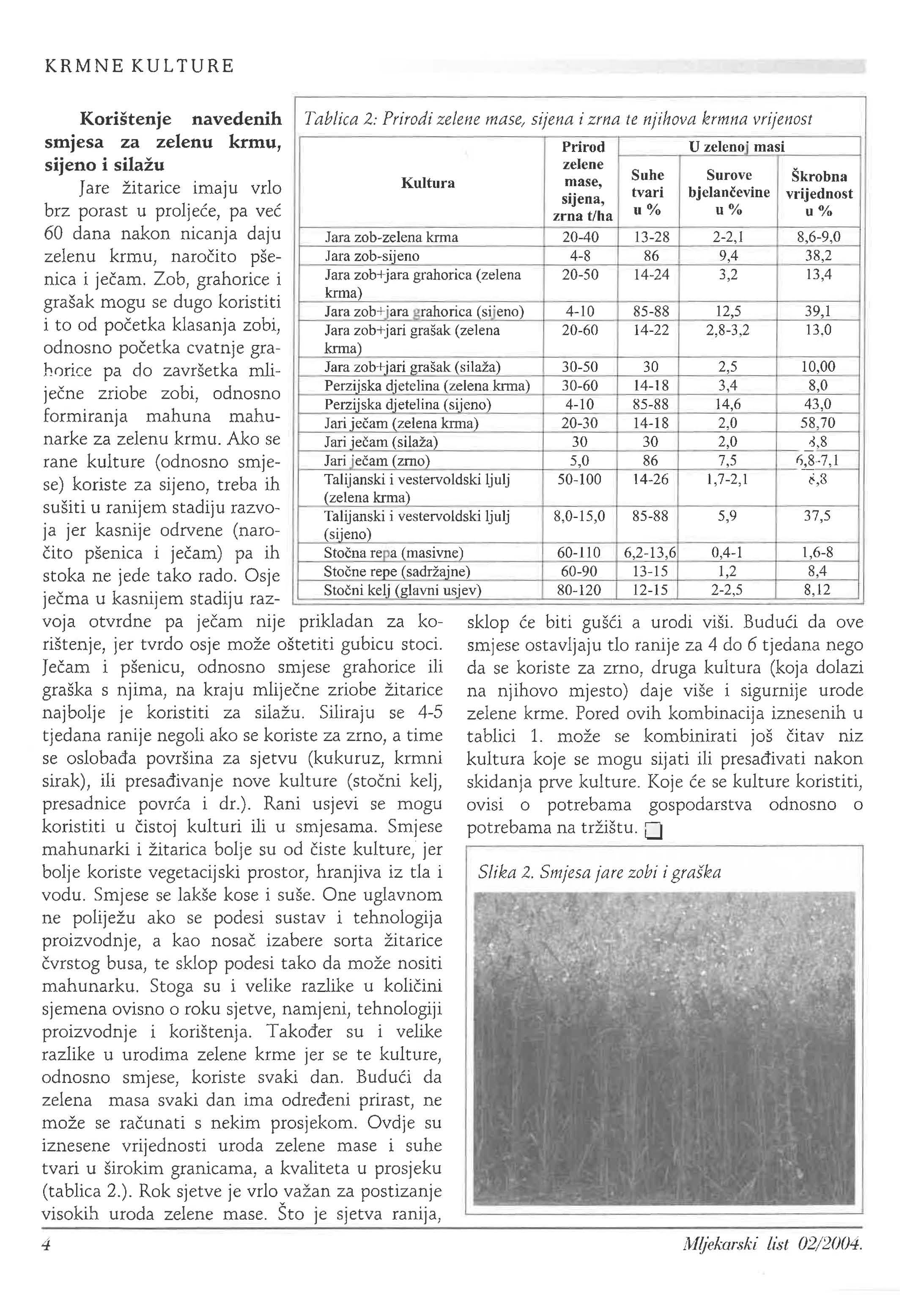 voja otvrdne pa nije prikladan za korištenje, jer tvrdo osje može oštetiti gubicu stoci. i pšenicu, odnosno smjese grahorice ili graška s njima, na kraju zriobe žitarice najbolje je koristiti za silažu. Siliraju se 4-5 tjedana ranije negoli ako se koriste za zrno, a time se površina za sjetvu (kukuruz, krmni sirak), ili nove kulture kelj, presadnice i dr.). Rani usjevi se mogu koristiti u kulturi ili u smjesama. Smjese mahunarki i žitarica bolje su od kulture, jer bolje koriste vegetacijski prostor, hranjiva iz tla i vodu. Smjese se lakše kose i suše. One uglavnom ne poliježu ako se podesi sustav i tehnologija proizvodnje, a kao izabere sorta žitarice busa, te sklop podesi tako da može nositi mahunarku. Stoga su i velike razlike u sjemena ovisno o roku sjetve, namjeni, tehnologiji proizvodnje i korištenja. su i velike razlike u urodima zelene krme jer se te kulture, odnosno smjese, koriste svaki dan. da zelena masa svaki dan ima prirast, ne može se s nekim prosjekom. Ovdje su iznesene vrijednosti uroda zelene mase i suhe tvari u širokim granicama, a kvaliteta u prosjeku (tablica 2.). Rok sjetve je vrlo važan za postizanje visokih uroda zelene mase. Što je sjetva ranija,