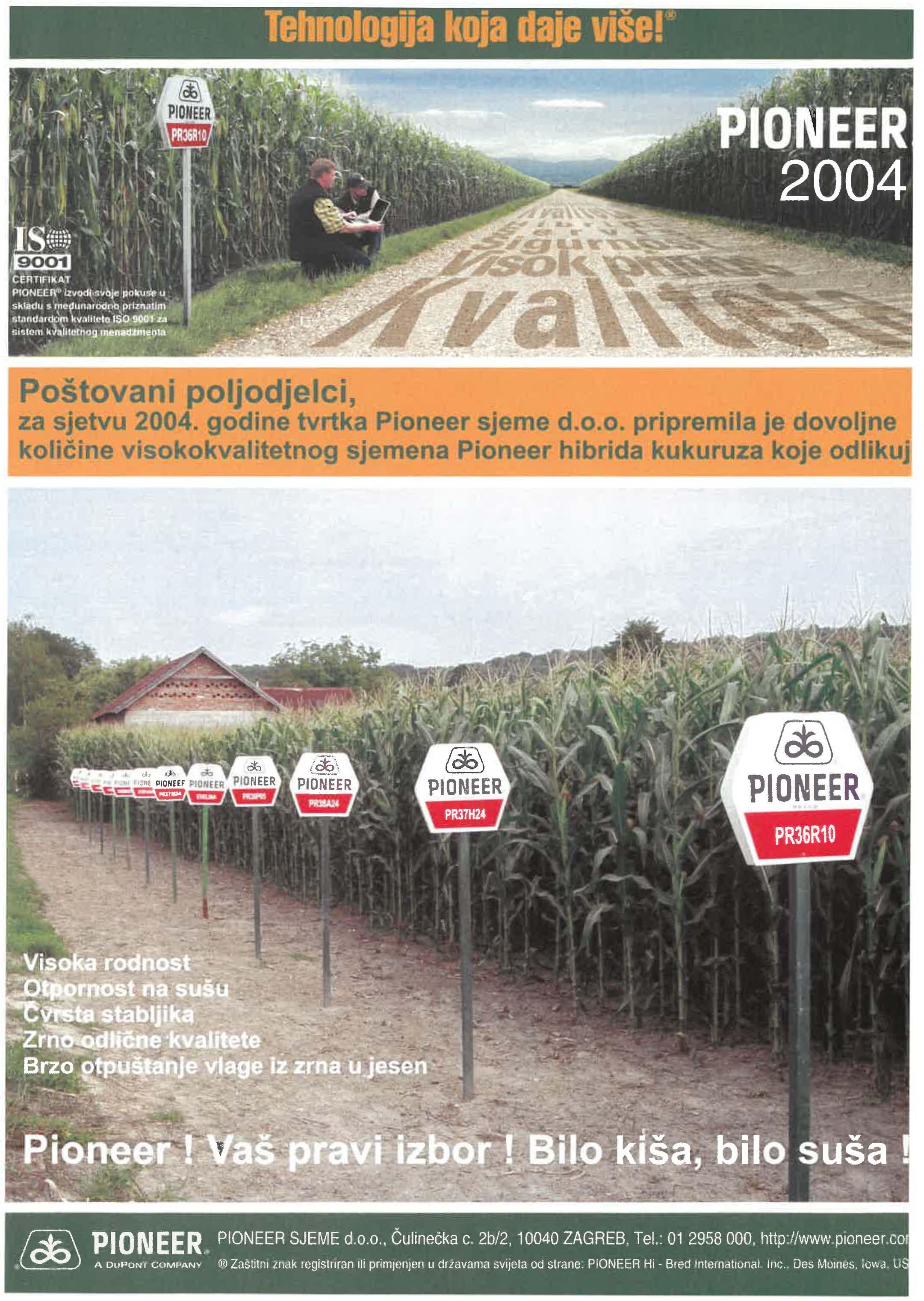 Postovan1 poljodjelci, za sjetvu 2004. godine tvrtka Pioneer sjeme d.o.o. pripremila je dovoljne visokokvalitetnog sjemena Pioneer hibrida kukuruza koje odlikuj