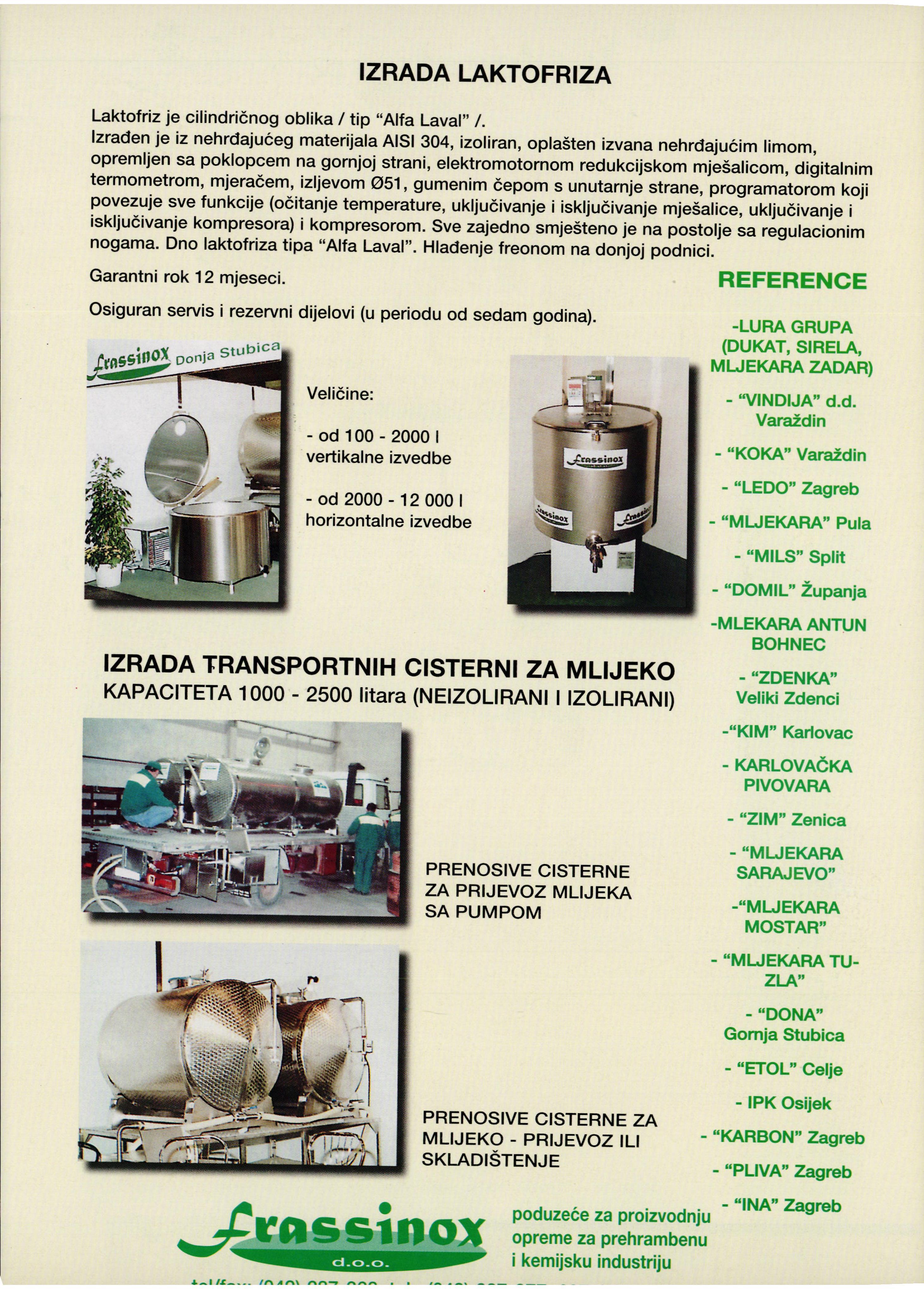 Izrađen jeiz nehrđajućegmaterijala AISI 304,izoliran,oplaštenizvana nehrđajućimlimom, opremljen sa poklopcem na gornjojstrani,elektromotornom redukcijskommješalicom,digitalnim termometrom,mjeračem,izljevom951,gumenimčepoms unutarnjestrane,programatoromkoji povezuje sve funkcije(očitanjetemperature,uključivanje i isključivanjemješalice,uključivanje i isključivanjekompresora) i kompresorom.Sve zajednosmještenojena postolje sa regulacionim nogama Dno laktofriza tipa“Alfa Laval" Hlađenjefreonom na donjojpodnici.